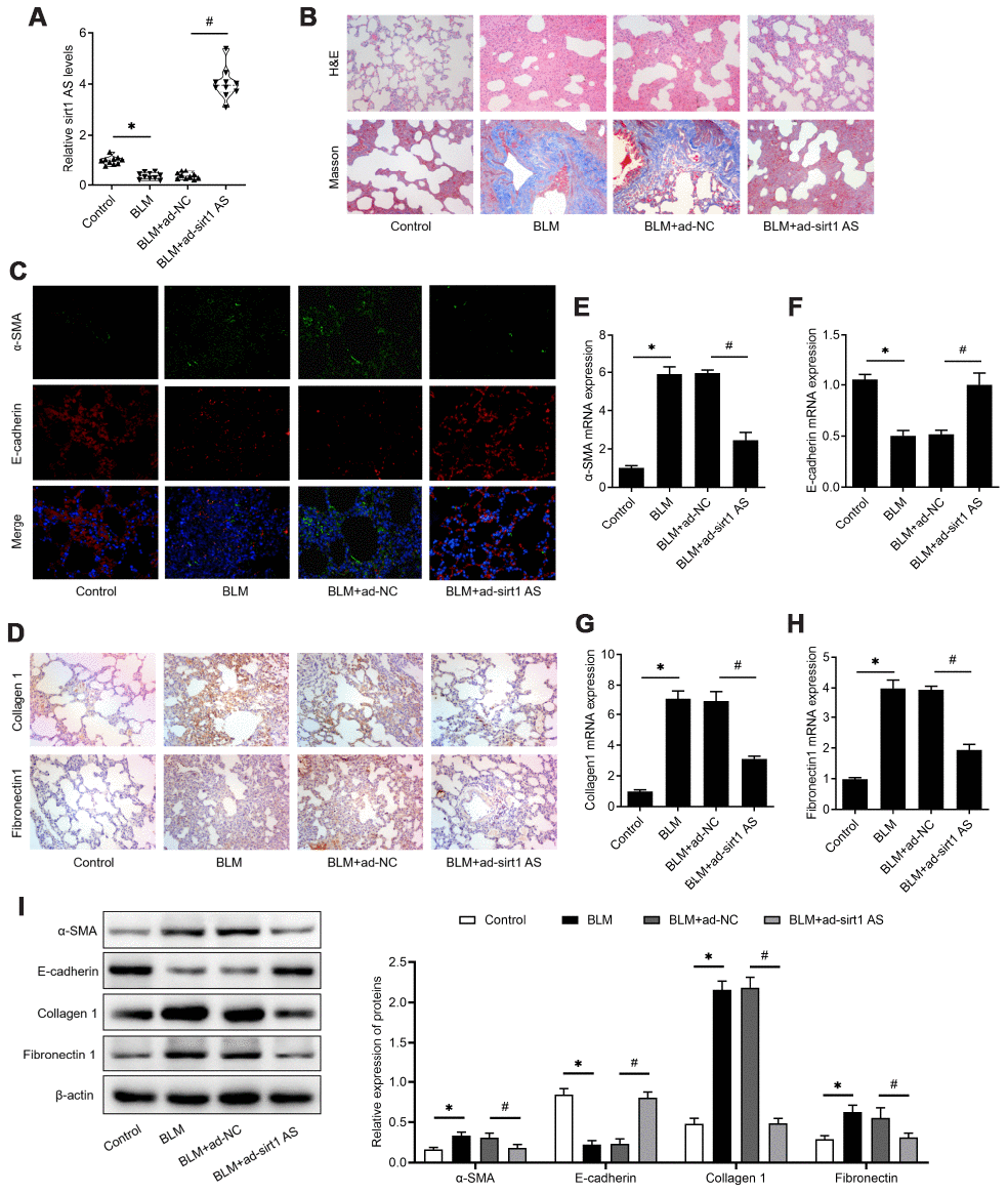 To validate the effect of sirt1 AS in IPF, mice were administrated with bleomycin (BLM) to induce IPF. The expression of sirt1 AS was also found to be down-regulated in lung tissues from IPF mice, and its expression was significantly up-regulated in IPF mice transfected with Ad-sirt1 AS (Figure 2A). We found that overexpression of sirt1 AS significantly alleviated BLM-induced lung tissues injury and collagen accumulation (Figure 2B). Through immunofluorescence and IHC analysis, we found overexpression of sirt1 AS could increase E-cadherin protein and decrease α-SMA, collagen1 and fibronectin1 protein in lung tissues (Figure 2C–2D). Accordingly, treated with Ad-sirt1-AS inhibited the up-regulation of α-SMA, collagen1 and fibronectin1 mRNA, and reversed the down-regulation of E-cadherin mRNA in IPF mice (Figure 2E–2H). Furthermore, to quantificationally validate the EMT in IPF mice, western blot was used. The results in Figure 2I showed that overexpression of sirt1-AS notably inhibited the up-regulation of α-SMA, collagen1 and fibronectin1 protein, and reversed the down-regulation of E-cadherin protein in IPF mice. Above data showed that overexpression of sirt1 AS alleviated BLM-mediated IPF through inhibiting EMT.