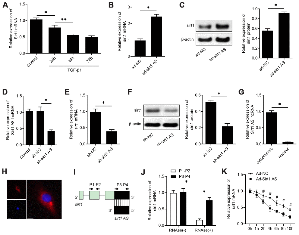 Real-time quantitative PCR (qPCR) was performed to detect the expression of sirt1 AS, and fibrogenesis-related genes. GAPDH was included as an endogenous control. In briefly, total RNA was extracted using TRIzol (Invitrogen). Concentration of the RNA was assessed with NanoDrop-2000 Spectrophotometer (NanoDrop Technologies, Germany), then reverse transcription using a PrimeScript reagent Kit With gDNA Eraser (Takara). The primers of target genes were synthesized by Shanghai bioengineering Co.Ltd. (Supplementary Table 2). QPCR was performed with a SYBR Green PCR kit (TaKaRa) and the expressions of target genes were calculated using the 2−ΔΔCt method.