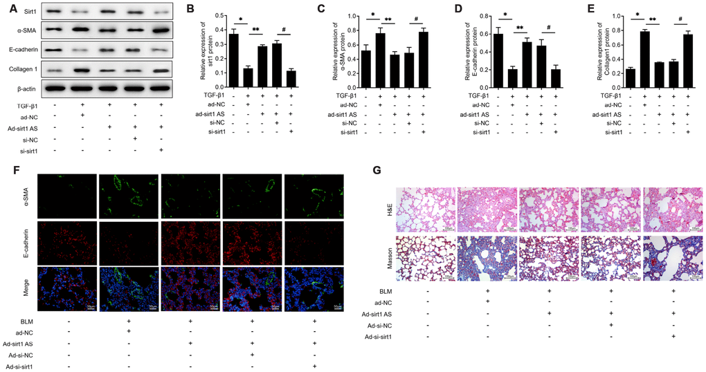 On the base of above findings, we therefore investigated whether sirt1 AS influenced the EMT progress in a sirt1 dependent way. The results of western blot analysis in Figure 4A showed that RLE-6TN cells transfected with si-sirt1 significantly down-regulated sirt1 proteins levels (Figure 4B) and knockdown of sirt1 effectively reversed the inhibitory effects of sirt1 AS on 10 ng/ml TGF-β1 induced EMT, as evidenced by the increased protein levels of SMA (Figure 4C) and collagen1 (Figure 4D), as well as the decreased protein levels of E-cadherin (Figure 4E). Moreover, immunofluorescent double staining validated that down-regulation of sirt1 could abolish the inhibitory effects of sirt1 AS on EMT in lung tissues (Figure 4F). Inhibition of sirt1 in BLM-induced mice could reverse the anti-fibrosis effects of sirt1 AS, as evidenced by the H&E and Masson staining (Figure 4G). These results strongly suggested that Sirt1 is involved in sirt1 AS regulated fibrogenesis in IPF.