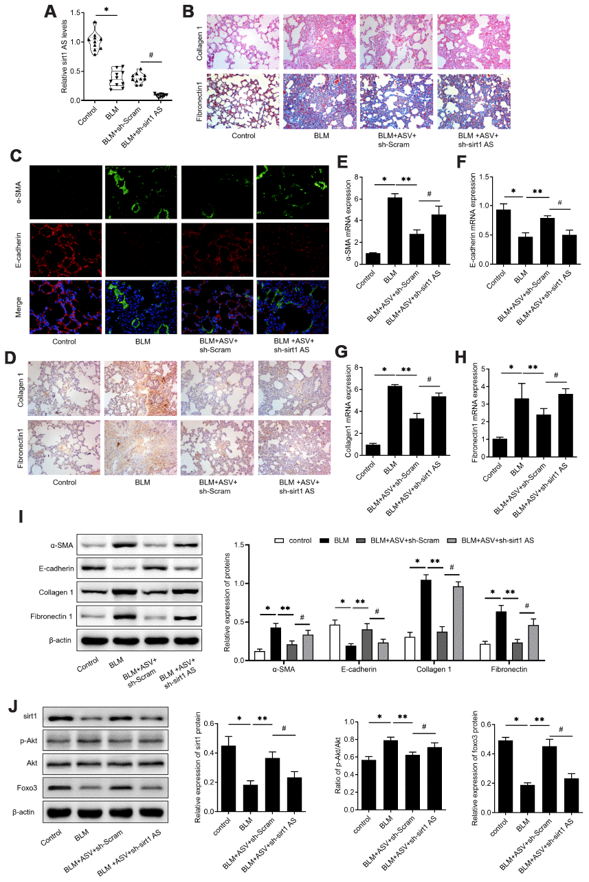 To validate the implication of sirt1 AS in the anti-fibrosis role of ASV on IPF, a loss-of-function approach was employed. Mice treated with sh-sirt1 AS showed significant decrease in sirt1 AS expression when compared with those treated with sh-Scram (Figure 6A). Knockdown of sirt1 AS at least partly reversed ASV alleviated pulmonary fibrosis, as evidenced by H&E and Masson trichrome staining (Figure 6B). Besides, immunofluorescent double labelled staining of pulmonary tissues showed that suppression of sirt1 AS could abolish ASV-induced α-SMA suppression and E-cadherin upregulation (Figure 6C). The results of immunohistochemistry also revealed that knockdown of sirt1 AS abrogated ASV-induced collagen1 and fibronectin1 upregulation (Figure 6D). Accordingly, after knockdown of sirt1 AS, the expression of α-SMA, collagen1 and fibronectin1 mRNA were increased, while E-cadherin mRNA was decreased (Figure 6E–6H). In addition, western blot analysis revealed that ASV treatment significantly reduced BLM-induced α-SMA, collagen1 and fibronectin1 protein expression, and increased E-cadherin protein expression. After knockdown of sirt1 AS, the expression of α-SMA, collagen1 and fibronectin1 mRNA were increased, while E-cadherin mRNA was decreased (Figure 6I). As we previously demonstrated that ASV inhibited Akt-mediated Foxo3 down-regulation to reverse EMT in IPF [19]. Here, we found that knockdown of sirt1 AS not only reduced ASV-induced sirt1, but also increased phosphorylated Akt to decrease Foxo3 expression in BLM treated pulmonary tissues (Figure 6J). These results indicated that sirt1 AS/sirt1/ foxo3 axis was involved in the anti-fibrosis function of ASV in IPF.