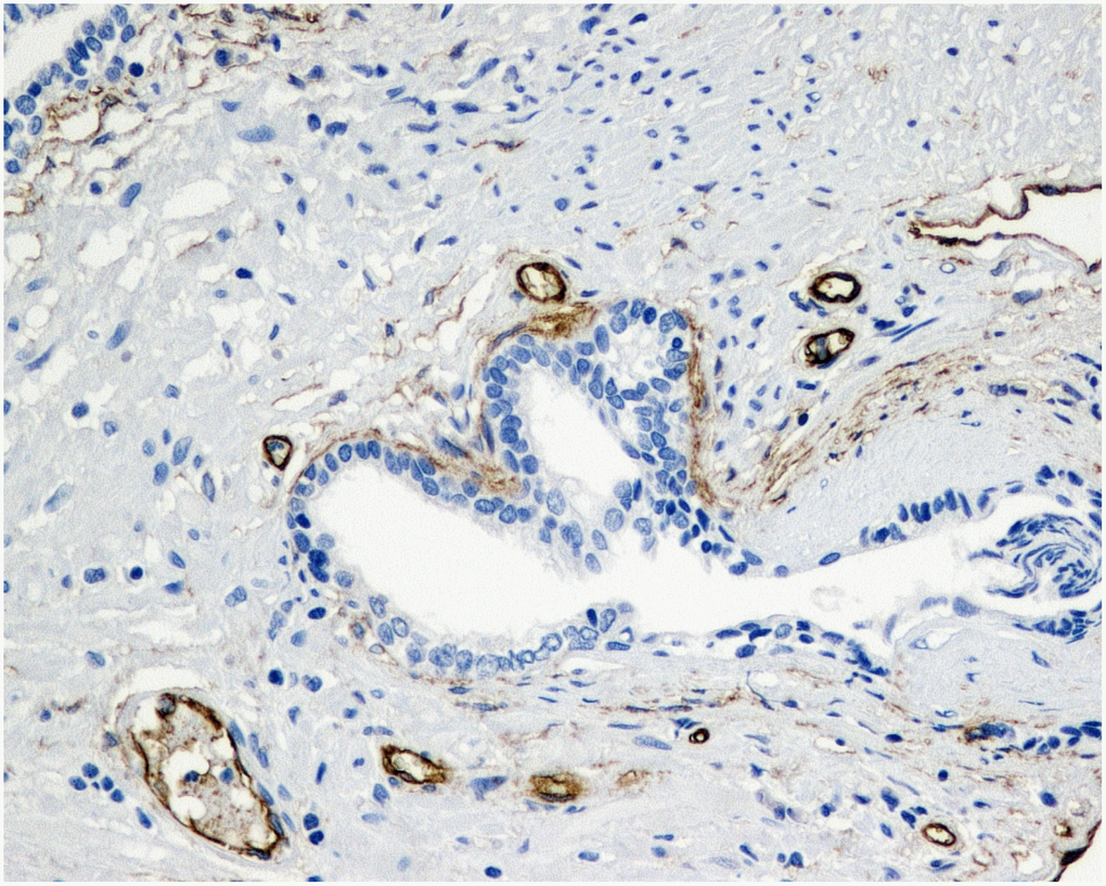 Tissue specimens stained with hematoxylin and eosin were fixed in 10% buffered formalin and embedded in paraffin. Sections were cut and slides were dewaxed in xylene and rehydrated through a graded series of ethanols. Heat-induced epitope retrieval was carried out by immersing the slides in citrate buffer (pH 6) and microwaving at 600 W for 20 minutes before rinsing with phosphate-buffered saline (PBS). Endogenous peroxidase activity was quenched by incubating the sections in 1% hydrogen peroxide. Nonspecific binding sites were then blocked by preincubating with 20% normal serum and 1% bovine serum albumin (BSA) in PBS/0.3% Triton X-100 (Union Carbide, Dow Corporation, Midland, MI) for 20 minutes at room temperature. Sections were incubated with polyclonal rabbit anti-VEGF antibody at a concentration of 1:50, as well as monoclonal murine anti-CD34 at a concentration of 1:20. After washing with 0.25% BSA and 0.05% polysorbate 20 in PBS, sections were incubated with biotinylated secondary pan-specific antibody at 1:500 for 1 hour at room temperature. Sections were again washed in PBS with 0.05% polysorbate 20, then incubated with horse radish peroxidase and conjugated streptavidin-biotin complex for 45 minutes. All sections were again washed in PBS with 0.05% polysorbate 20. Immunoreactivity was then visualized by adding hydrogen peroxide as an enzyme substrate, in the presence of 0.05% 3,3′-diaminobenzidine. Nuclei were then lightly counterstained with Harris’s hematoxylin. The area of most intense neovascularization was selected by scanning on low magnification (10-100×), avoiding areas with lymphocytic infiltration or fibrosis. Any brown-staining endothelial cell (CD34-positive) containing a visible nucleus and clearly separate from adjacent microvessels, epithelial cells, and other connective tissue elements, was considered a single, countable microvessel, without requirement for a lumen or the presence of erythrocytes. The microvessels were counted in a 0.74-mm2 area. VEGF immunoreactivity was scored for the percentage of stained epithelial glandular and endothelial cells, as 0, 1+, 2+, or 3+, according to staining intensity. A hypertrophic area with any degree of staining was scored as VEGF-positive. Hyperplastic areas that were VEGF-positive and VEGF-negative were assigned the score of the area with strongest staining Figures 1 and 2.