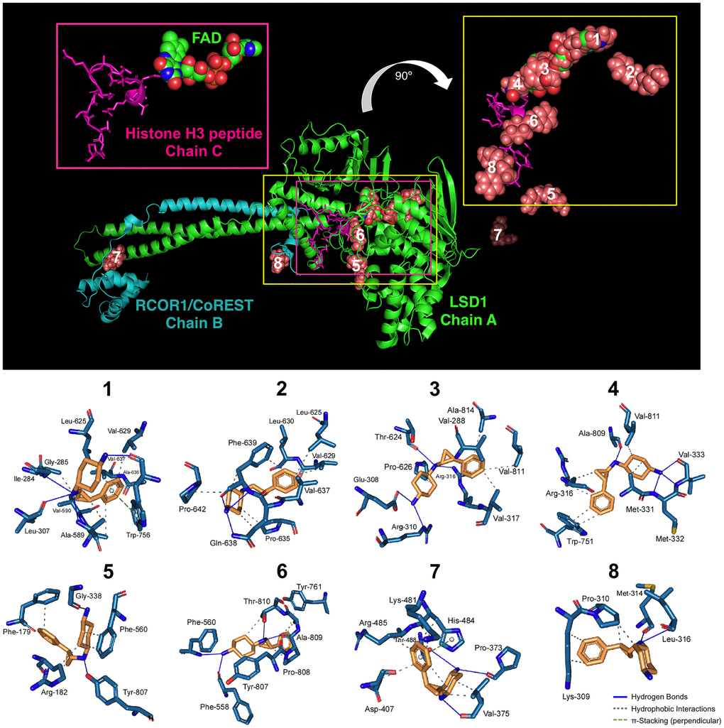 Two different models have been proposed to explain the mechanism of action of iadademstat. In the first, iadademstat rapidly and irreversibly binds the LSD1 cofactor FAD in a manner analogous to the monoamine oxidase inhibitor tranylcypromine [18]. In the second, iadademstat physically separates LSD1/RCOR1 from the SNAG-domain transcription repressor GFI1 and chromatin in a cell-type-specific manner [19]. Taking advantage of the solved three-dimensional structure of LSD1 in a ternary complex with its histone peptide substrate and RCOR1/CoREST, we aimed to computationally explore a working model whereby iadademstat might operate via both a catalytic/enzymatic mechanism involving highly potent, direct targeting of the FAD cofactor (at lower concentrations), and a scaffolding/structural mechanism involving inhibition of the chromatin binding activity of LSD1/RCOR1 (at higher concentrations). Docking simulations of iadademstat in a crystal structure of human LSD1 (chain A) including RCOR1/CoREST (chain B) – a co-repressor that collaborates to demethylate mono- and di-methylated H3-K9 in nucleosomes – and a histone H3 peptide (chain C), produced eight clusters of docking poses (Figure 1). When the docking results were ranked according to the ascent of the binding energies for iadademstat (up to -9.09 kcal/mol; Table 1), those clusters exhibiting the highest affinity (#1, #3, and #4, see inset on the top right of Figure 1) were in the nanomolar range and were predicted to occupy the same binding site as FAD in LSD1. Cluster #6 was predicted to interfere with the position of the histone H3 peptide, whereas clusters #7 and #8, with affinities in the low micromolar range, were predicted to interact with both the LSD1 enzyme and RCOR1/CoREST.