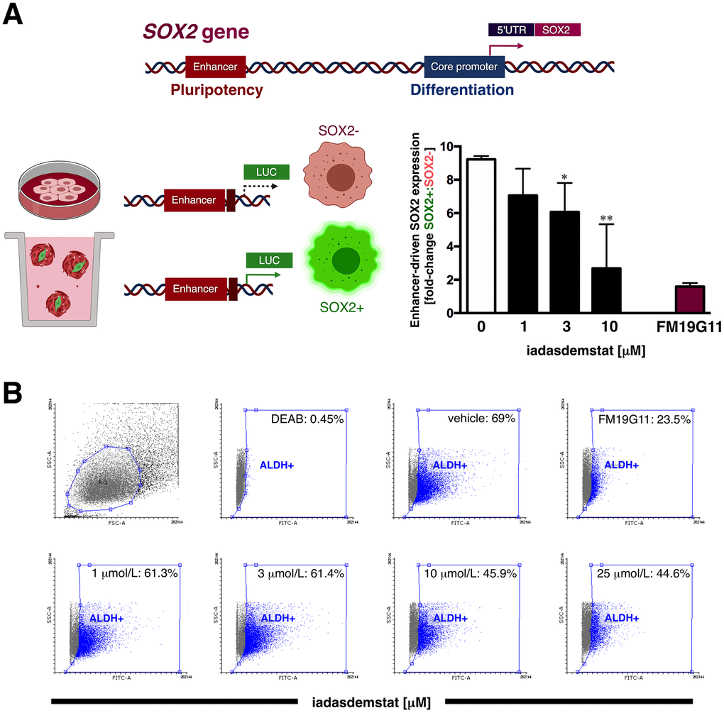 LSD1-blocking compounds are known to differentially target pluripotent cancer cells including teratocarcinoma, embryonic carcinoma, and seminoma, or embryonic stem cells that express SOX2, while having minimal growth-inhibitory effects on non-pluripotent cancer or normal somatic cells [15, 16, 23]. We therefore envisioned that iadademstat might suppress CSC function by repressing the re-activation of SOX2 in breast CSC, a transcriptional phenomenon that specifically occurs through activation of the distal enhancer of the SOX2 promoter that also controls SOX2 transcription in pluripotent stem cells [32, 33]. When we transfected tamoxifen-resistant, luminal-B/HER2+ BT-474 cells [34] with a luciferase reporter vector containing the SOX2 distal enhancer region, we observed a robust induction (9.2-fold on average) of reporter activity in mammosphere cultures when compared with the adherent culture control (Figure 3A). Of note, the enhancer-driven transcriptional activation of SOX2 differentially occurring in mammosphere cultures was dose-dependently suppressed by iadademstat (up to 80% reduction at 10 μmol/L; Figure 3A). Importantly, iadademstant-driven SOX2 silencing drastically reduced the number of BT-474 mammospheres (data not shown).