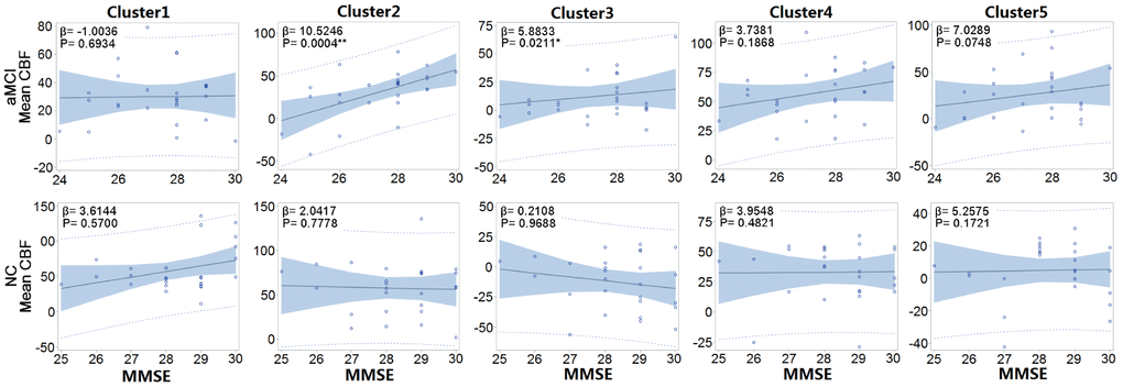 Demographic and clinical characteristics were analyzed as follows: continuous variables were expressed as the mean and standard deviation (SD), and were compared using two-sample two-tailed t-tests, while categorical variables were expressed as frequencies (%) and compared between groups using chi-square tests. A generalized linear model (GLM) was used to evaluate the association between mean CBF and MMSE score for each cluster in the aMCI group and NC groups after adjusting for gender, age, education, hypertension, diabetes, stroke, heart disease, and APOE-ε4 genotype status. P values were estimated using two-tailed tests. A P < 0.05 was considered statistically significant. All data analysis was performed using SAS 9.4 (SAS Institute Inc., Cary, NC, USA).