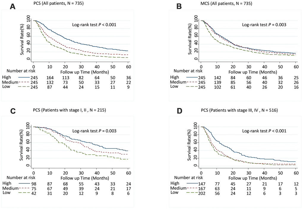 A total of 735 patients were recruited in this study. The characteristics of the HCC patients and the distributions of PCS and MCS by patient characteristics in this study are shown in Supplementary Table 1. The mean age was 61.7 years (standard deviation [SD]: 12.0 years); the patients were mostly men (549 [74.7%]) and non-Hispanic white (469 [63.8%]). The most common etiologies were HCV and/or HBV infection (186 [25.3%]) and alcohol abuse (186 [25.3%]). Five hundred eighty-four (79.5%) patients were diagnosed with Child-Pugh A, and 516 (70.6%) were diagnosed with stages III and IV. Among the 192 patients who had undergone prior treatment, 67 (34.9%) had been treated by curative therapy (surgical and ablation therapies). The mean PCS and MCS scores were 37.9 (SD: 12.1) and 46.3 (SD: 11.3), respectively. A number of variables were associated with PCS and MCS scores, for example, current smokers had significantly lower PCS and MCS scores than never smokers and patients with worse clinical features and symptoms (e.g., worse Child-Pugh scores, presence of cirrhosis or portal vein thrombosis, higher tumor stage, and increased AFP, CA19-9, ALP, bilirubin, or serum albumin) had lower PCS and MCS scores. Notably, a panel of elevated systemic inflammatory response (SIR) markers was associated with lower PCS and MCS scores. Patients with high white blood cell (WBC) counts, high neutrophil counts, and high neutrophils-to-lymphocyte ratio (NLR) had lower PCS and MCS scores, whereas patients with high lymphocytes and high lymphocytes-to-monocyte ratio (LMR) had significantly higher PCS and MCS scores (Supplementary Table 1).
