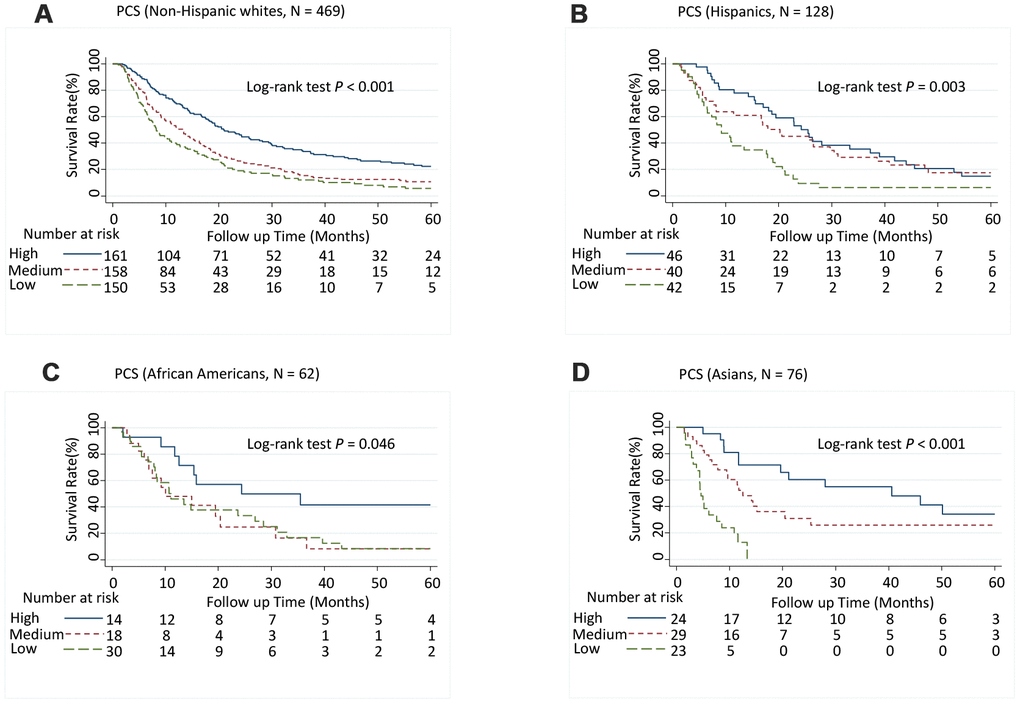 Patients with medium PCS (hazard ratio [95% CI], 1.52 [1.23-1.89]; P < 0.001) and low PCS scores (1.72 [1.36-2.17]; P < 0.001) had significantly increased risk of death (P-trend < 0.001) (Table 1) and significantly shorter MST than did patients with high PCS scores (log-rank P < 0.001; Figure 1A). Although patients with low MCS scores had a significantly shorter MST than did those with high MCS group scores (log-rank P = 0.003; Figure 1B), the association between MCS score and the risk of death was not significant after adjusting for confounders in multivariate Cox analysis (Table 1). When further stratified by stage or race and ethnicity, the effect of low PCS score was consistent between patient with stage I and II disease and stage III and IV disease (Figure 1C and 1D) and among all races and ethnicities (Figure 2). We also performed stratified analyses by sex, prior treatment, cirrhosis, and portal vein hypertension history and found similar results (Supplementary Table 5 and Supplementary Figures 1, 2).