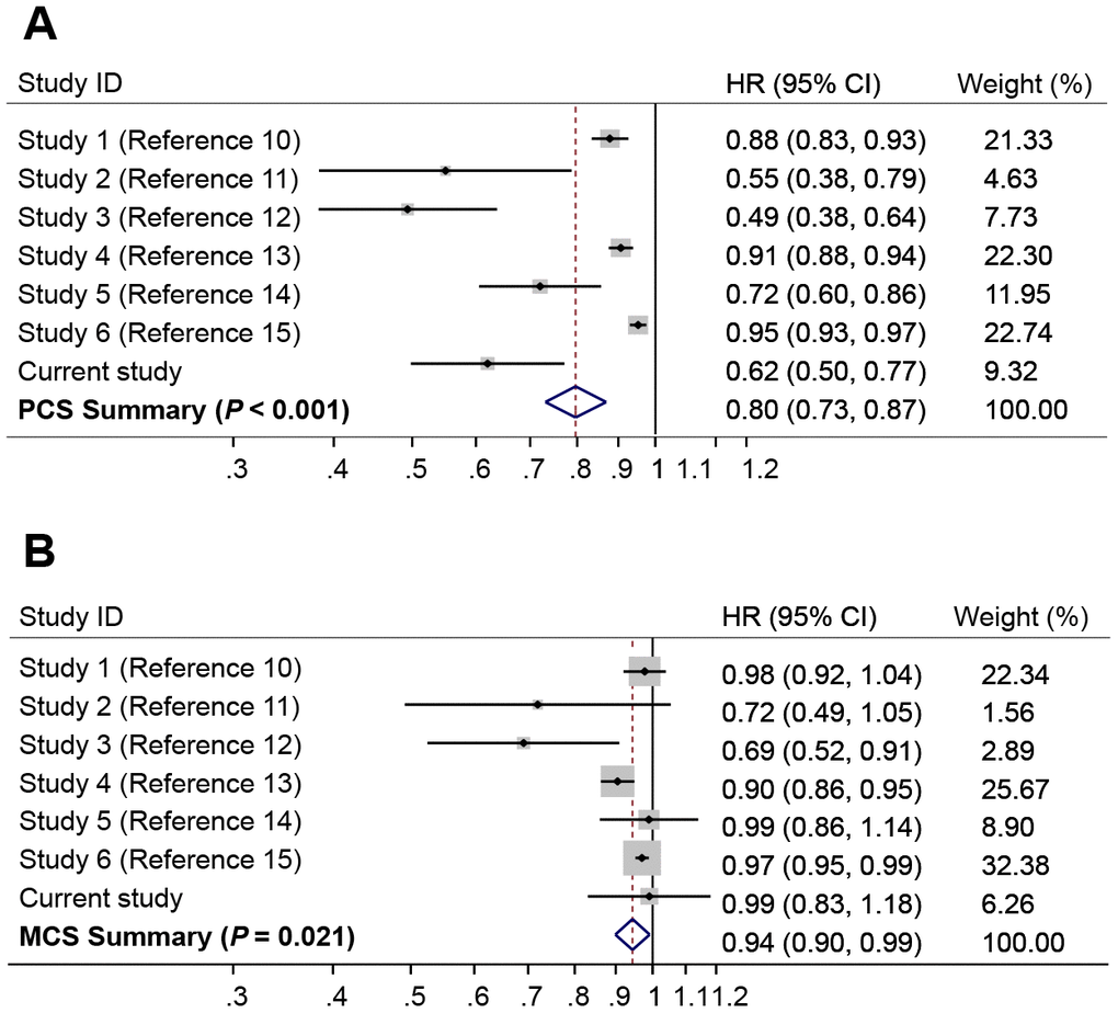 A number of publications have evaluated the associations of PCS and MCS with overall survival in HCC patients [10–15]. We performed a random effect meta-analysis for the associations of HCC survival with PCS or MCS. The results showed that higher PCS was strongly associated with a reduced risk of death (HR = 0.80, 95% CI = 0.73-0.87, P < 0.001) (Figure 3A), whereas higher MCS was associated with a modestly reduced risk of death (HR = 0.94, 95% CI, 0.90-0.99, P = 0.021) (Figure 3B). There was significant heterogeneity between different studies for the association of survival with PCS (I2 = 90.4%, P < 0.001) and MCS (I2 = 61.0%, P = 0.017).