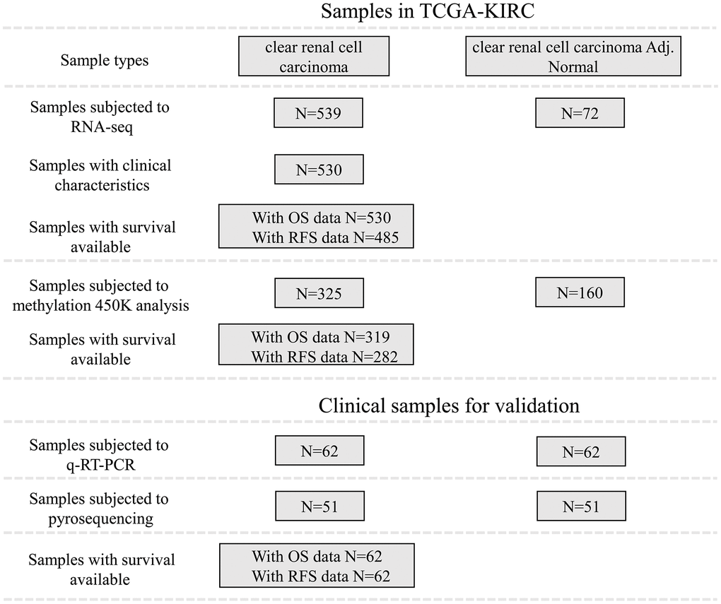 Level-3 RNA-sequencing data, the clinicopathological and survival data of patients with ccRCC were downloaded from TCGA (https://portal.gdc.cancer.gov/). The data availability of the patients included were summarized in Figure 1. Briefly, 539 ccRCC and 72 adjacent normal renal tissues were included in this study. Their clinical and survival data, including tumor stage, lymph node, metastasis, pathological stage, neoplasm histologic grade, OS and RFS, were downloaded. In addition, DNA methylation data (measured by the Infinium Human- Methylation450 BeadChip) that contains the data of 325 ccRCC and 160 adjacent normal renal tissues were also downloaded.