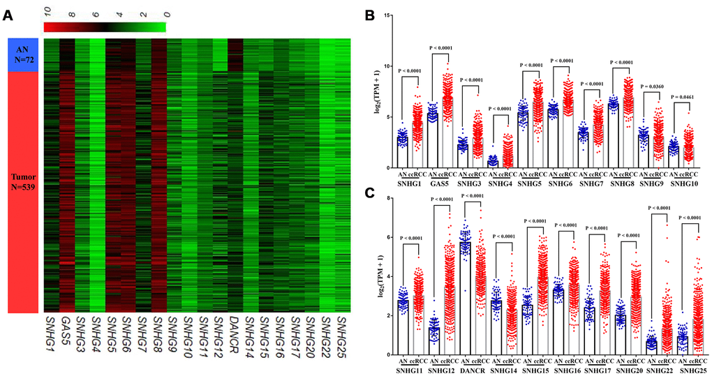 In TCGA-KIRC cohort, tumor tissues from 539 cases of ccRCC were subjected to RNA-seq study, among which 72 cases had matched adjacent normal tissues (Figure 1). Using RNA-seq data in TCGA-KIRC, we compared the expression of lncRNAs encoding snoRNAs between ccRCC tissues and the matched adjacent normal tissues. Results showed that compared with adjacent normal tissues, SNHG1, GAS5, SNHG3-8, SNHG11, SNHG12, SNHG15-17, SNHG20, SNHG22 and SNHG25 were significantly upregulated in ccRCC tissues, while SNHG9, SNHG10, DANCR and SNHG14 were remarkably downregulated in ccRCC tissues (Figure 2A–2C).