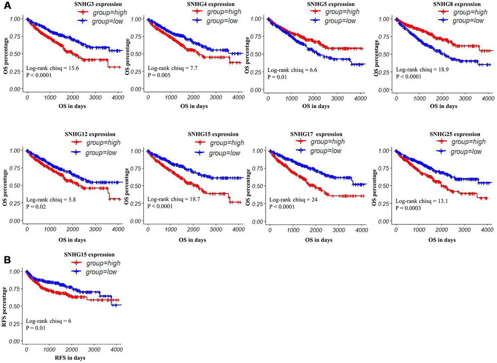 To explore the prognostic values of lncRNAs encoding snoRNAs, we used the TCGA-Clinical data to analyze their relevances with the Overall Survival (OS) and Relapse-Free survival (RFS) among ccRCC patients by generating Kaplan–Meier survival curves (Figure 1), and the detailed clinical characteristics of patients with ccRCC in TCGA were shown in Table 1. Results of the log-rank test showed that the high expression groups of SNHG3, SNHG4, SNHG12, SNHG15, SNHG17 and SNHG25 had significantly shorter OS, while high SNHG5 and SNHG8 expression groups had remarkably longer OS (Figure 3A). Moreover, results of the log-rank test also showed that the high SNHG15 expression group had significantly shorter RFS than its low expression group (Figure 3B).