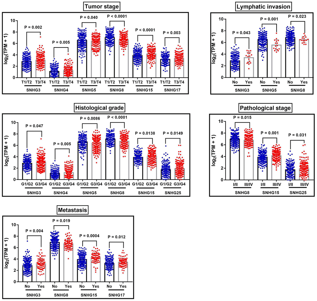 In addition, these SNHGs expression were closely related to some clinical parameters of ccRCC, including tumor stage, lymphatic invasion, metastasis, pathological stage and histological grade (Table 4, Figure 4). Compared with early-stage (T1/T2) ccRCC, the expression levels of SNHG3, SNHG4, SNHG15 and SNHG17 were significantly higher in advanced-stage (T3/T4) ccRCC. Moreover, SNHG3, SNHG4 and SNHG15 were highly expressed in high histological grade ccRCC compared to low histological grade ccRCC. Furthermore, the expression levels of SNHG3 and SNHG15 in ccRCC with remote metastasis were remarkably higher.