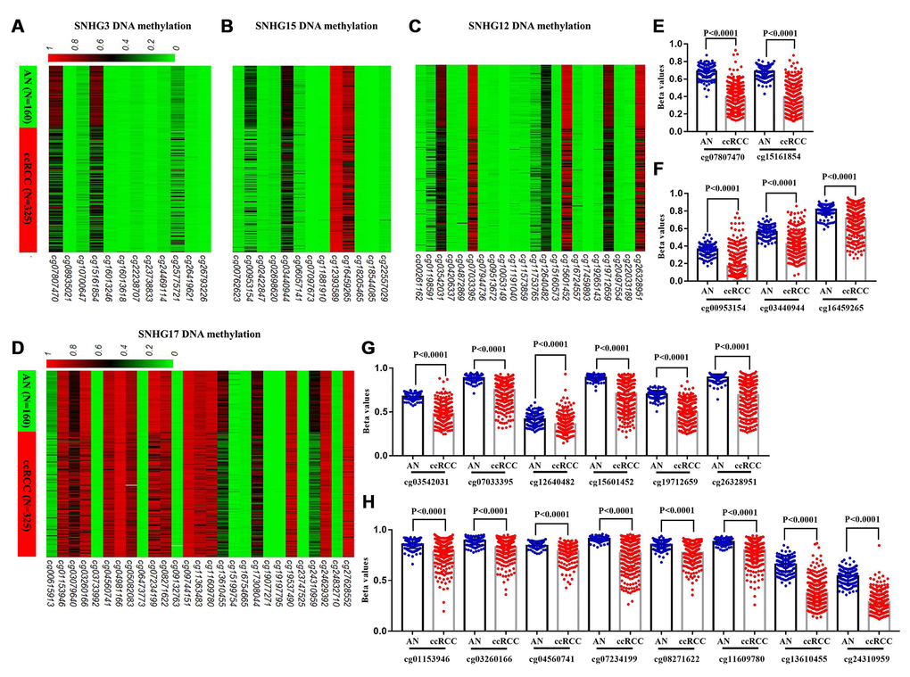 In TCGA-KIRC, 325 ccRCC tissues samples and 160 adjacent normal tissues samples were subjected to DNA methylation analysis simultaneously (Figure 1). Using the methylation data obtained from the Infinium Human Methylation450 BeadChip, we compared the methylation status of 12 CpG sites in SNHG3 DNA, 13 CpG sites in SNHG15 DNA, 22 CpG sites in SNHG12 DNA and 24 CpG sites in SNHG17 DNA (Table 5). The heatmap constructed on beta values of these CpG sites across all 485 samples was shown in Figure 5A–5D. The analysis results showed that compared with adjacent normal tissues, 2 sites of SNHG3 DNA, 3 sites of SNHG15 DNA, 6 sites of SNHG12 DNA and 8 sites of SNHG17 DNA were significantly hypomethylated in ccRCC (Figure 5E–5H).