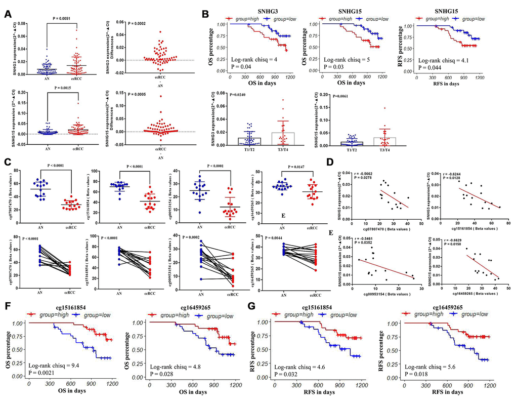 In addition, the methylation status of 4 CpG sites (cg07807470, cg15161854, cg00953154 and cg16459265) in 15 paired clinical samples were tested through pyrosequencing. In the whole population, the methylation levels of 4 methylation sites were consistent with the TCGA cohort. The methylation levels of cg07807470, cg15161854, cg00953154 and cg16459265 were significantly lower in ccRCC compared with adjacent normal tissues (Figure 7C). The representative results of pyrosequencing for methylation status in two paired samples were shown in Supplementary Figure 1. Besides, the methylation levels of cg07807470 (r=-0.5662) and cg15161854 (r=-0.6244) were significantly negatively correlated with SNHG3 expression (Figure 7D), while the methylation levels of cg00953154 (r=-0.5461) and cg16459265 (r=-0.6629) were negatively associated with SNHG15 expression (Figure 7E), which were consistent with the results from the TCGA datasets. Furthermore, the methylation levels of cg15161854 with a higher correlation with SNHG3 expression and cg16459265 with a higher correlation with SNHG15 expression in another 36 available ccRCC samples were tested through pyrosequencing for survival analysis. Consistent with the survival analysis results of TCGA samples, our results showed that low methylation levels of cg15161854 and cg16459265 were associated with the shorter OS (Figure 7F) and RFS (Figure 7G) of ccRCC patients.
