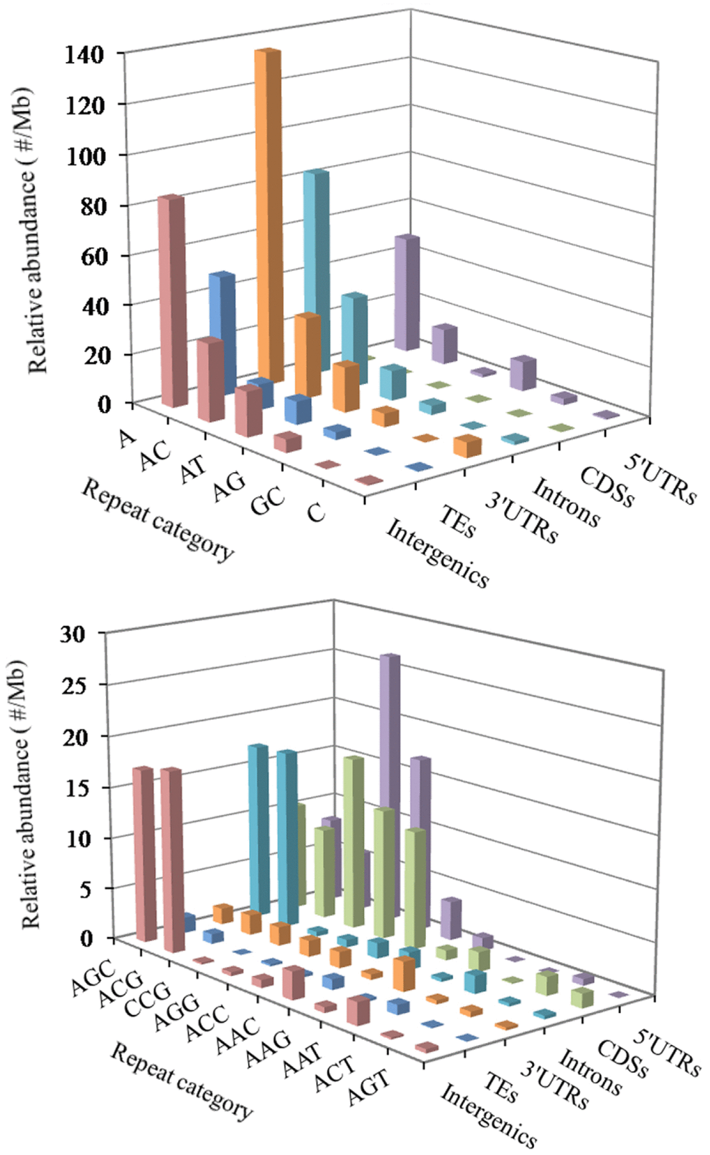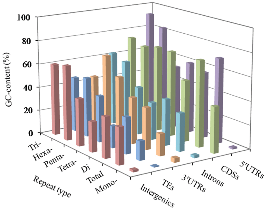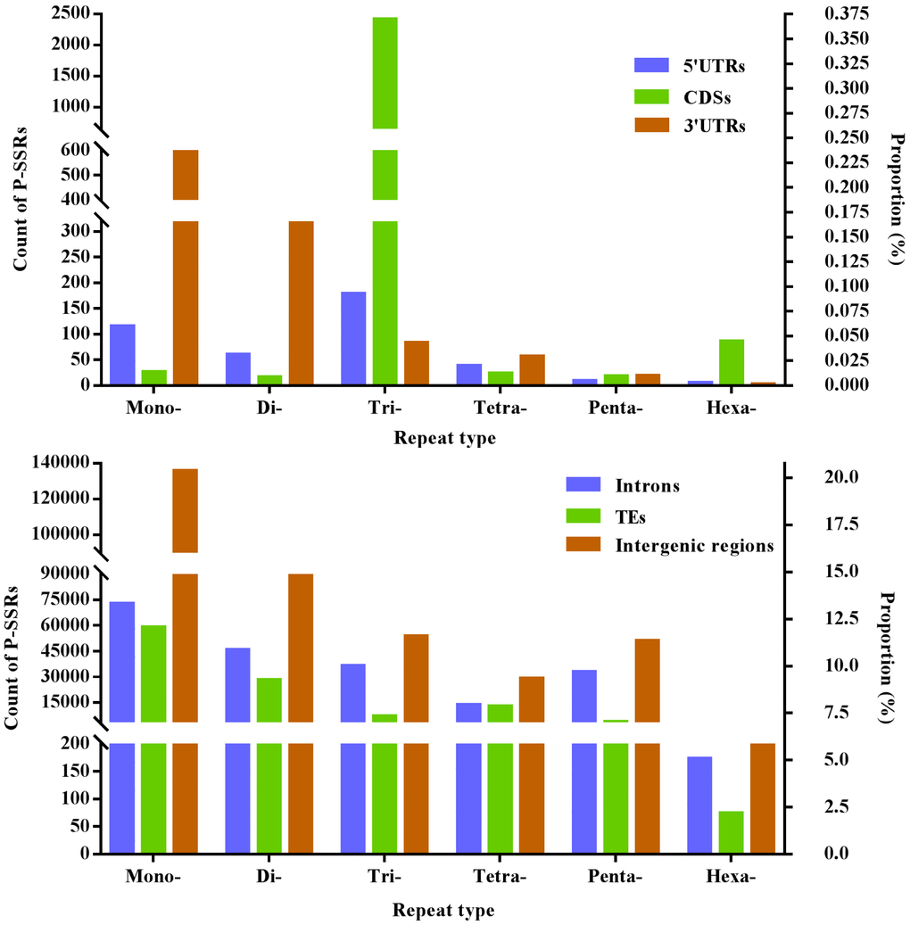 In the 5′UTR regions, the (A)n was the most abundant repeat unit, the next was the (CCG)n, and then were the (AGG)n, (AC)n, (AG)n, (AGC)n, (ACG)n, and (CCCG)n in order (Figure 3). In the CDS regions, the (CCG)n was the most abundant motifs, next were the (AGG)n, (ACC)n, (ACG)n, and (AGC)n, the third were the (AAG)n and (ACT)n (Figure 3). In the intronic regions, the (A)n was the most abundant motif, the next was the (AC)n, and then were the (ACG)n, (AGC)n, (AT)n, (AG)n and (AAAT)n in order (Figure 3). In the 3′UTR regions, the (A)n was the most abundant unit, next was the (AC)n, and then were the (AT)n, (AG)n and (C)n in order (Figure 3). In the TEs, the (A)n was the most common repeat unit, the next were the motif (AC)n and (AT)n, and then were the (AG)n, (AAAT)n, (AAT)n, (AAC)n, (AGC)n, and (AAAC)n in order (Figure 3). In the intergenic regions, the (A)n was the most abundant repeat unit, next was the motif (AC)n, and then were the (AT)n, (AGC)n, (ACG)n, (AG)n, (AAAT)n, (AAC)n, (AAT)n, and (AAAC)n in order (Figure 3). Therefore, it is inferred that there are the nonrandom distribution of P-SSR motifs in these different genomic regions.