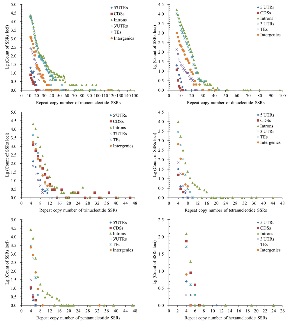 The RCN of trinucleotide SSRs had the fewest numbers of SSRs loci in the 5′UTR and 3′UTR regions (Figure 4). In the RCN of tetra- and pentanucleotide P-SSRs, the intron regions had the most numbers of SSRs loci, followed by the TEs and intergenic regions, the 5′UTR and CDS regions had fewer counts of SSRs loci (Figure 4). In the RCN of hexanucleotide P-SSRs, the numbers of P-SSRs loci had increased obviously in the CDSs regions in comparison to other genomic regions (Figure 4). The results showed that the RCN of different P-SSRs was significantly decreased with increasing of nucleotide repeat units.
