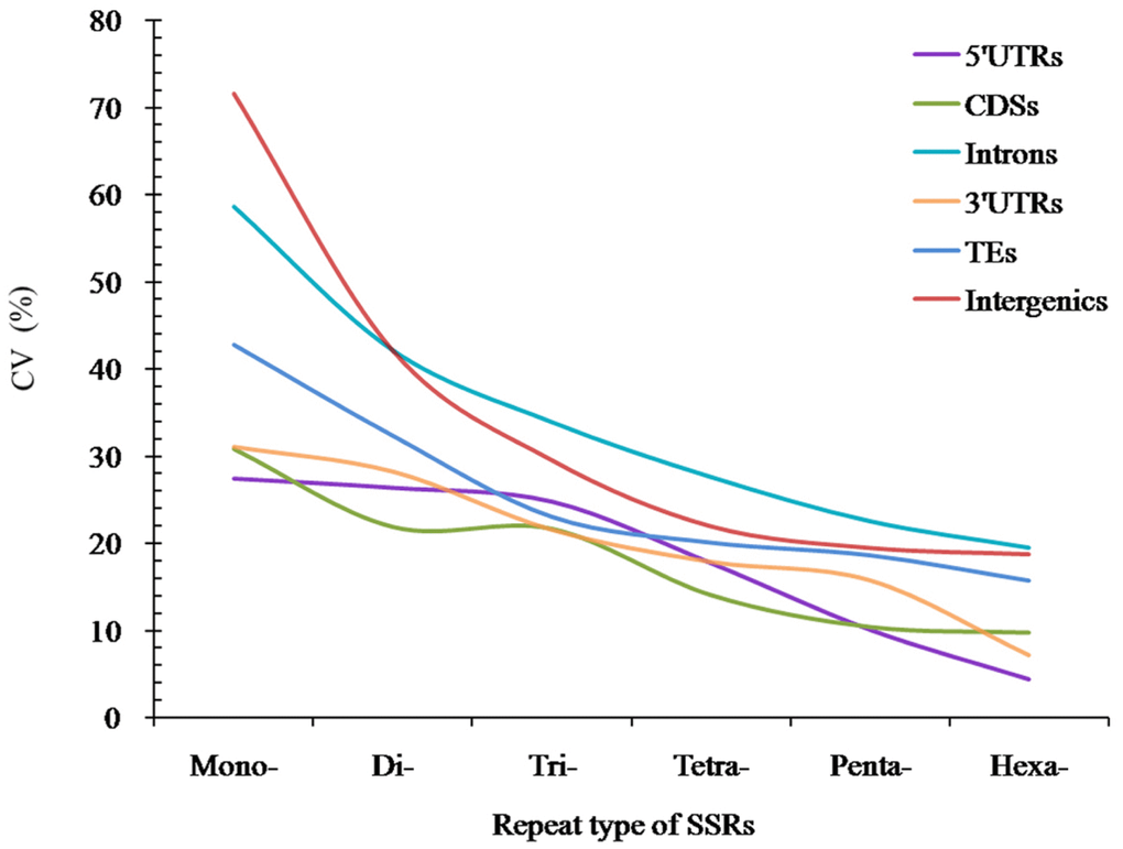 The analysis of coefficient of variability (CV) of SSRs showed that the RCN variation of different P-SSRs had significantly decreased from mono- to hexanucleotide P-SSRs (Figure 5). In the CDS region, there were of similar CV variation in the di- and trinucleotide P-SSRs (Figure 5). The CV variation of the same P-SSRs had obviously difference in the six regions of FMD genome. The intronic and intergenic regions had relative higher CV variations of the RCN for the same P-SSRs, followed by the TEs, and the rest genomic regions had relative lower CV variations of the RCN (Figure 5).