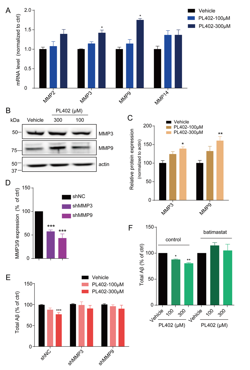 PL402 promotes the expression of MMP3 and MMP9 which are involved in the effect of PL402 on Aβ level modulation. (A) The mRNA level of Aβ degradation enzymes (MMPs) in SK-N-SH cells treated by vehicle (0.1% DMSO) or PL402 at 100μM and 300μM for 24h. N=4. (B–C) Representative image of a western blot showing the expression of MMP3 and MMP9 in SK-N-SH cells after treatment with vehicle (0.1% DMSO), or PL402 at 100μM and 300μM for 24h. Actin was used as a loading control (B). (C) The quantification analysis of (B) using ImageJ. N=3. (D) The mRNA level of MMP3 and MMP9 in SK-N-SH cells with the infection of scrambled, MMP3 or MMP9 gene-specific shRNA. N=4. (E) The levels of total Aβ produced by SK-N-SH cells measured by ELISA after treatment with vehicle (0.1% DMSO) or PL402 at 100μM and 300μM for 24 h in the cells infected with scrambled, MMP3 or MMP9 gene-specific shRNA. N=4. (F) The total Aβ level in SK-N-SH cells with presence or absence of the PL402 for 24h after pretreatment with vehicle (0.1% DMSO), or 10μM MMP inhibitor (batimastat) for 1h. N=3. Data are presented as the mean ± SEM, n >3 independent experiments. *p<0.05, **p<0.01, ***p<0.001 compared to the control of each group or the control of the shNC group. One-way ANOVA or two-way ANOVA followed by Bonferroni test.