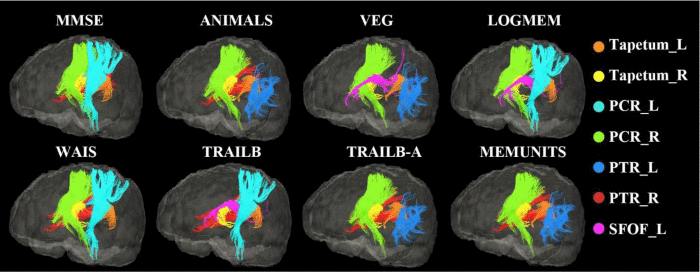 Several specific regions, including the bilateral tapetum, posterior corona radiata, and posterior thalamic radiation (include optic radiation), showed strong associations with the prediction of cognitive performance, and these correlations were verified in DTI images. The tapetum is located on either side of the corpus callosum with fibers connecting the posterior corpus callosum and medial temporal lobe and covering the central part of the lateral ventricle. It has been reported that subjects with a family history of Alzheimer’s disease have a lower FA in the left tapetum [37], and that patients with Alzheimer’s disease have a lower FA and higher MD in these white matter regions [38, 39]. These regions were also associated with cognitive flexibility in young and middle-aged adults with dyskinetic cerebral palsy, a disease resulted from damage to the basal ganglia [40]. In addition, the bilateral posterior thalamic radiations, posterior corona radiata, and thalamocortical and corticocortical connections, which widely connect among the thalamus, parietal and occipital lobes, also appear to contribute greatly in the prediction of cognitive performance. This result is consistent with the significant association between thalamic pathology and memory loss in early Alzheimer’s disease, especially episodic memory, which is one of the earliest cognitive deficits in dementia [41, 42]. When predicting performance in neuropsychological tests, including the Wechsler Memory Scale-Revised, Category Fluency, and Trail Making Test (score: VEG, LOGIMEM and TRAILB), the superior fronto-occipital fasciculus, an association fiber tract connecting the frontal, occipital, parietal and temporal lobes, also exhibited high weight [43]. The superior fronto-occipital fasciculus is the only association fiber tract that projects medially to the thalamus and along the ventricle, and it is widely recognized to be an important connection between the insula and the parieto-frontal circuit, which are involved in crucial cerebral functions such as memory, language, emotion, and behavior [44].