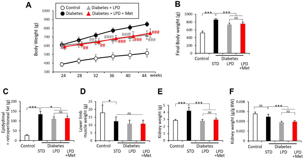 The overall body weight (BW) changes of rats are presented in Figure 1A. At the start of the experimental period, overall BW was not significantly different among all three groups of Wistar fatty (diabetic) rats. The diabetes + STD group gained more BW than did the diabetes + LPD and diabetes + LPD + Met groups during the experimental period (Figure 1A). The overall BW and epididymis/retroperitoneal fat weights of the diabetes + LPD and diabetes + LPD + Met groups were significantly lower than those in the diabetes + STD group at the end of the study (Figure 1B and 1C). There was no difference on overall BW and epididymis/retroperitoneal fat weights between the LPD and LP + Met diets in diabetic rats (Figure 1B and 1C). Neither the LPD nor the LP + Met diet affected lower limb muscle weights in diabetic rats at the end of the study (Figure 1D). The kidney weight of the diabetes + LPD and diabetes + LPD + Met groups was significantly lower than that in the diabetes + STD group at the end of the study (Figure 1E and 1F). There was no difference on kidney weight between the LPD and LP + Met diets in diabetic rats (Figure 1E and 1F). The overall BW, epididymis/retroperitoneal fat weights and kidney weight of diabetes + STD group were significantly higher than those in the Wistar lean (control) group, and the lower limb muscle weights of diabetes + STD group were significantly lower than those of control group (Figure 1B–1E). However, there was no difference of kidney weight per g BW between control group and diabetes + STD group (Figure 1F).