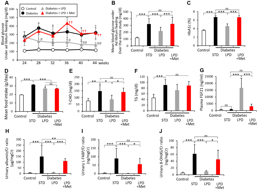 The diabetes + LPD group exhibited lower blood glucose levels under ad libitum feeding than those of the diabetes + STD group. However, the diabetes + LPD + Met group showed high levels of blood glucose under ad libitum feeding, which were similar to those of the diabetes + STD group (Figure 2A). The LPD resulted in an improvement in mean blood glucose levels under ad libitum feeding during the experimental period and hemoglobin A1c (HbA1c) levels at the end of the study, in diabetic rats (Figure 2B and 2C). However, the LP + Met diet attenuated the effect of the LPD on diabetic status, showing an elevation of mean blood glucose levels under ad libitum feeding and HbA1c in diabetic rats (Figure 2B and 2C). The mean food intake (g/day) was reduced in both the diabetes + LPD and diabetes + LPD + Met groups compared to that in the diabetes + STD group during the experimental period (Figure 2D). However, the mean food intake between the diabetes + LPD and diabetes + LPD + Met rats was not different (Figure 2D). The mean food intake (g/g BW/day) in the diabetes + STD, diabetes + LPD and diabetes + LPD + Met groups was 0.042 ± 0.004, 0.040 ± 0.003 and 0.040 ± 0.002 (g/g BW/day) and was not statistically significant. Plasma fasting total cholesterol (T-CHO) and triacylglycerol (TG) levels were also significantly elevated in diabetes + STD compared to levels in control rats (Figure 2E and 2F) at the end of the study. The increases in T-CHO levels in the diabetes + STD group were reduced by the LPD. However, the diabetes + LPD + Met treatment produced elevated T-CHO levels. The LPD and LP + Met diet did not lead to a statistically significant difference in the TG levels of diabetic rats (Figure 2E and 2F). The plasma fibroblast growth factor21 (FGF21) levels were markedly increased in the diabetes + LPD group; however, the LP + Met diet decreased the levels of plasma FGF21 in diabetic rats at the end of the study (Figure 2G). There was no statistically significant difference in the levels of plasma FGF21 between diabetes + STD and diabetes + LPD + Met groups. The mean blood glucose levels under ad libitum feeding during the experimental period, HbA1c, plasma fasting T-CHO and TG levels at the end of the study were significantly higher in the diabetes + STD group than the levels in the control group (Figure 2A–2F).