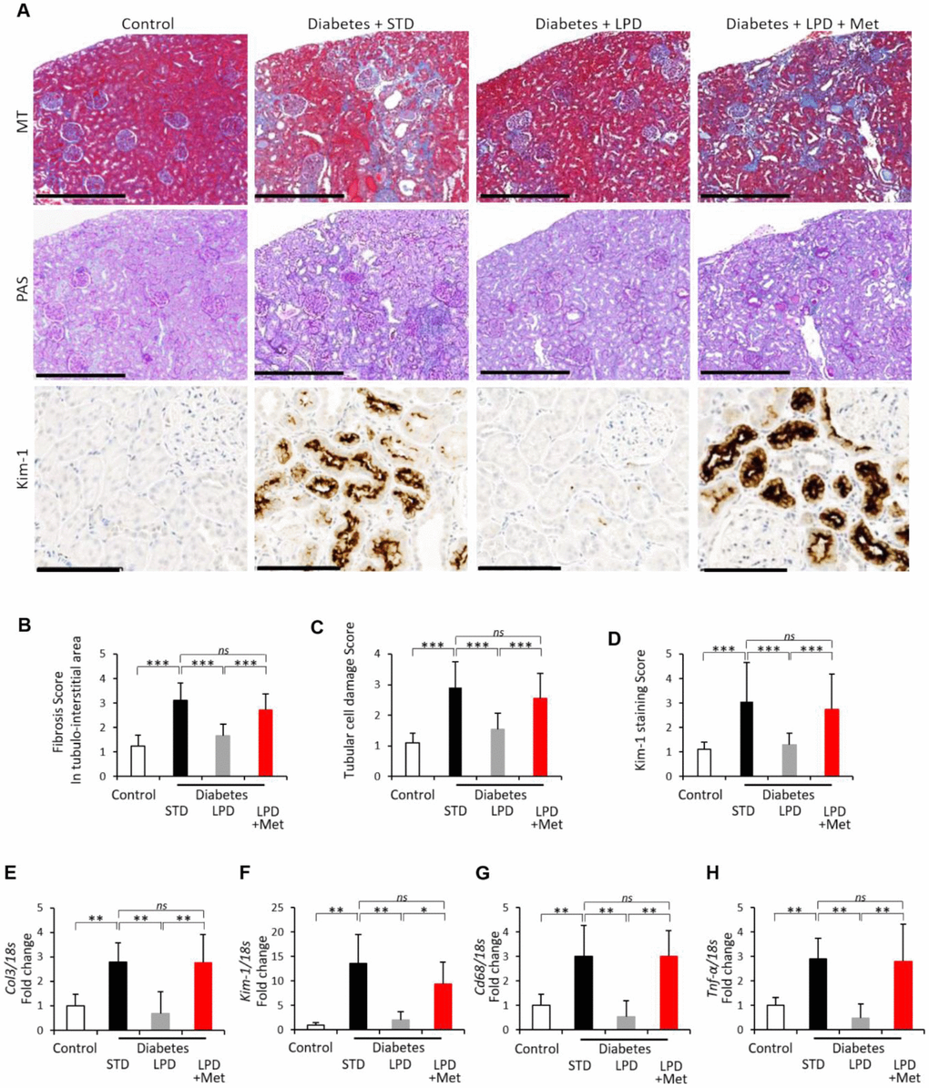Representative photomicrographs of Masson’s trichrome (MT) staining, Periodic Acid Schiff (PAS) staining and kidney injury molecule-1 (Kim-1) immunohistochemically stained kidney sections from each rat group are shown in Figure 3A. The renal fibrosis scores in the tubule-interstitial area and renal tubular damage scores evaluated by MT and PAS staining were significantly higher in the diabetes + STD group than those in the control group (Figure 3B and 3C). The Kim-1 staining scores in the diabetes + STD group were also significantly higher than the scores in the control (Figure 3D). Diabetes + STD rats showed that the mRNA expression of type 3 collagen (Col3), Kim-1, Cd68 and tumor necrosis factor-α (Tnf-α) in the renal cortex was significantly increased compared to that in the control (Figure 3E to 3H). Renal fibrosis, tubular cell damage and inflammation in diabetic rats were improved by the LPD; however, the LP + Met diet exacerbated all renal alterations (Figure 3A to 3H).