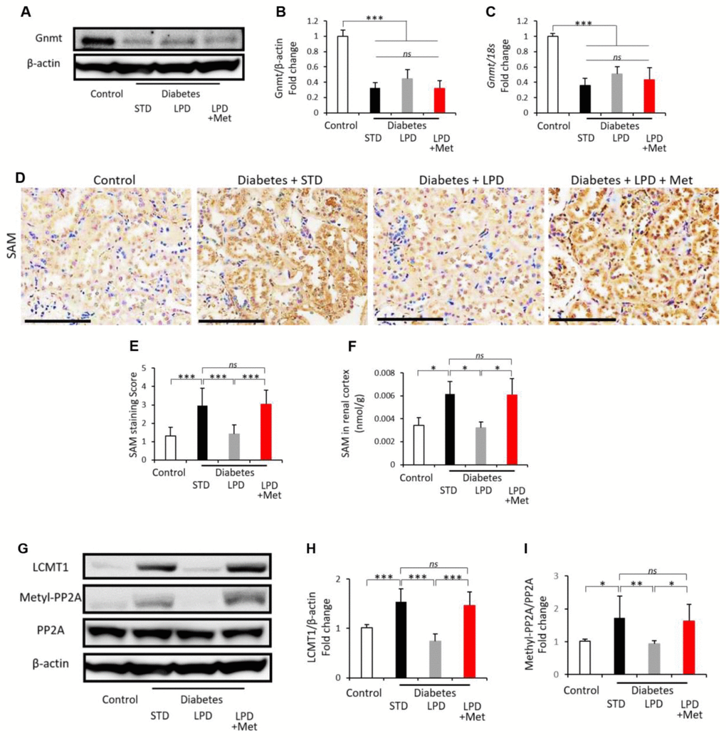 Gnmt expression in the renal cortex was evaluated by western blotting and real time-polymerase chain reaction (PCR) (Figure 4A–4C). Both the protein and mRNA levels of Gnmt expression were markedly reduced in the diabetic renal cortex compared to those of the control (Figure 4A–4C). Neither the LPD nor the LP + Met diet affected Gnmt expression levels in diabetic rats (Figure 4A–4C). The immunohistochemical staining intensity of SAM was clearly enhanced in renal tubular cells in diabetes + STD rats compared to that in controls (Figure 4D and Figure 4E). SAM levels in renal cortex was also elevated in diabetes +STZ rats compared to those in controls (Figure 4F). The LPD reduced the SAM staining intensity and SAM levels; however, the LP + Met diet increased the levels of SAM staining intensity and SAM levels in diabetic rats (Figure 4D-4F). Leucine carboxyl methyltransferase 1 (LCMT1) can methylate the catalytic subunit of protein phosphatase 2A (PP2A) in response to SAM, leading to activation of PP2A (Figure 4E–4G-4I). In the renal cortex of diabetes + STD rats, both the expression levels of LCMT1 and methyl-PP2A were significantly increased compared to those of the control (Figure 4E–4G-4I). The diabetes + LPD rats exhibited a decrease in the expression of LCMT1 and methyl-PP2A; however, the diabetes + LPD + Met rats showed an elevation in LCMT1 and methyl-PP2A expression (Figure 4E–4G-4I).