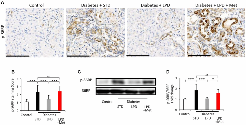 Diabetes + STD showed an increased intensity of immunohistochemical staining for phospho-S6 ribosomal protein (p-S6RP) (a downstream effector molecule of mTORC1) in tubular lesions compared to that in the control rats, and LPD decreased the intensity of its staining to levels similar to those observed in the controls (Figure 5A and 5B). However, LPD + Met increased the staining levels of p-S6RP in diabetic kidneys (Figure 5A and 5B). The p-S6RP expression evaluated by western blotting was also enhanced in the renal cortex of the diabetes + STD group compared to expression in the control group, and the increased p-S6RP expression in diabetic renal cortex was significantly decreased by the LPD (Figure 5C and 5D). The LP + Met diet induced increased p-S6RP expression in the diabetic renal cortex (Figure 5C and 5D).