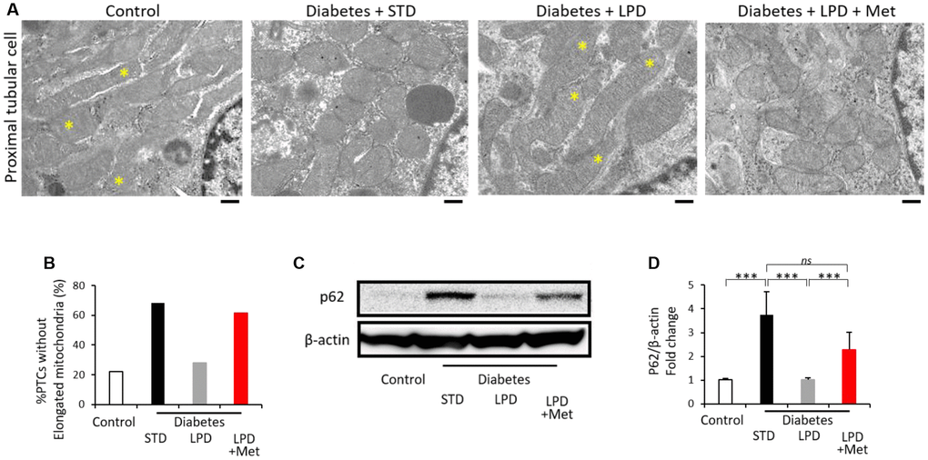 Diabetes + STD exhibited alterations in mitochondrial morphology in PTCs, such as fragmented mitochondria and increased numbers of PTCs without elongated mitochondria (Figure 6A and 6B). The LPD improved the alterations in mitochondrial morphology (Figure 6A and 6B); however, the LP + Met diet in diabetic rats abrogated the effect of the LPD on the alteration of mitochondrial abnormality (Figure 6A and 6B). Immunohistochemical staining for p62 was significantly enhanced in the renal cortex of the diabetes + STD group, indicating the impairment of autophagy. The LPD ameliorated p62 expression in the kidneys of diabetic rats (Figure 6C and 6D). However, diabetes + LPD + Met rats exhibited increased p62 expression in the renal cortex (Figure 6C and 6D).