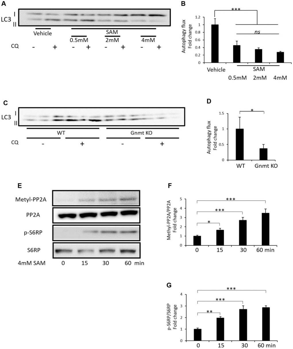 To clarify whether SAM itself suppresses autophagy, we analyzed microtubule associated protein light chain 3-II (LC3-II) turnover through preventing lysosomal degradation by using chloroquine (CQ), in cultured HK-2 cells (human kidney proximal tubular cells) and renal cortex of Gnmt KO mice. Administration of SAM suppressed amino acid-free-induced autophagy in cultured HK-2 cells (Figure 7A and 7B). Additionally, in the renal cortex of Gnmt KO mice, which accumulate SAM in the organs, including the liver and kidney, 48-hour starvation-induced autophagy in the renal cortex was suppressed compared to wild type mice (Figure 7C and 7D). Furthermore, administration of SAM induced the increased expression of methyl-PP2A and p-S6RP, which were normalized to PP2A or S6RP, from 15 min to 60 min in cultured HK-2 cells (Figure 7E–7G).
