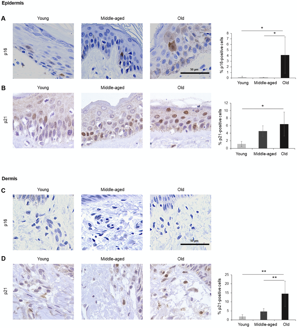 The largest organ in the body, the skin covers and protects the entire external surface. We analyzed separately the two main skin layers, epidermis and dermis. In the epidermis, the outermost layer of the skin, cells positive for p16 or p21 increased with age, reaching 4% and 6% of total cells in Old, respectively (Figure 2A, 2B). As observed in other tissues in this study, p16 staining was observed in both the nucleus and cytoplasm of cells in the epidermis (Figure 2A), while p21 staining was mainly nuclear (Figure 2B). In the dermis, by contrast, we were unable to detect p16 (Figure 2C), and p21 increased with aging (Figure 2D). These results agree with previous reports showing that p16-positive cells accumulate in skin during aging and that a progressive accumulation of senescent keratinocytes and fibroblasts causes alterations in skin architecture and function, leading to tissue deterioration [37–39].