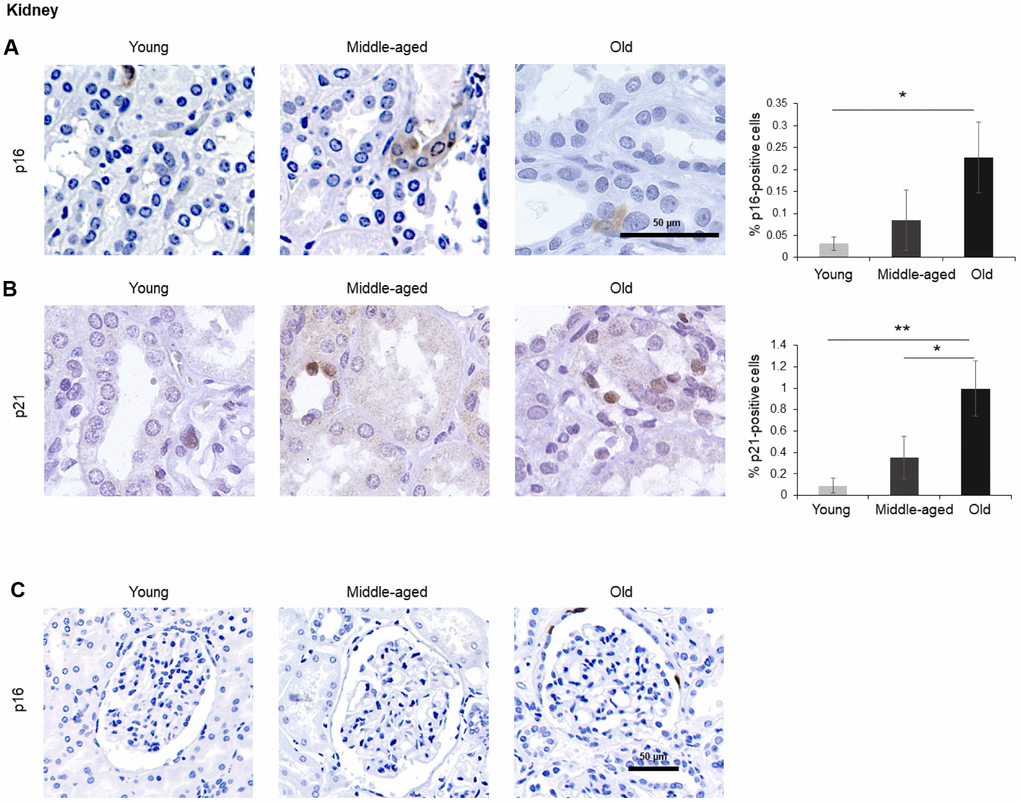 A small number of p16-positive cells increasing moderately with donors’ age (up to 0.2% of all cells) was observed in the kidney. Positive p16 staining was mainly present in the tubules and was distributed in both nucleus and cytoplasm (Figure 3A), although we identified a few p16-positive cells in the Bowman capsule of Old donors (Figure 3C). In addition, p21-positive cells also increased significantly with age (reaching up to 1% in the Old group); these cells were localized in renal tubules, and the signal for p21 was restricted to the nucleus (Figure 3B). These observations are in keeping with earlier reports [40].