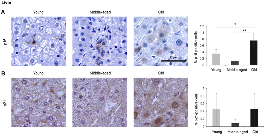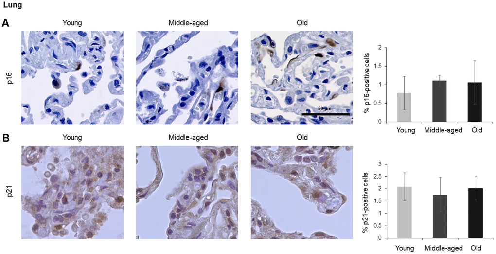 Changes in senescence marker proteins p16 and p21 in different organs