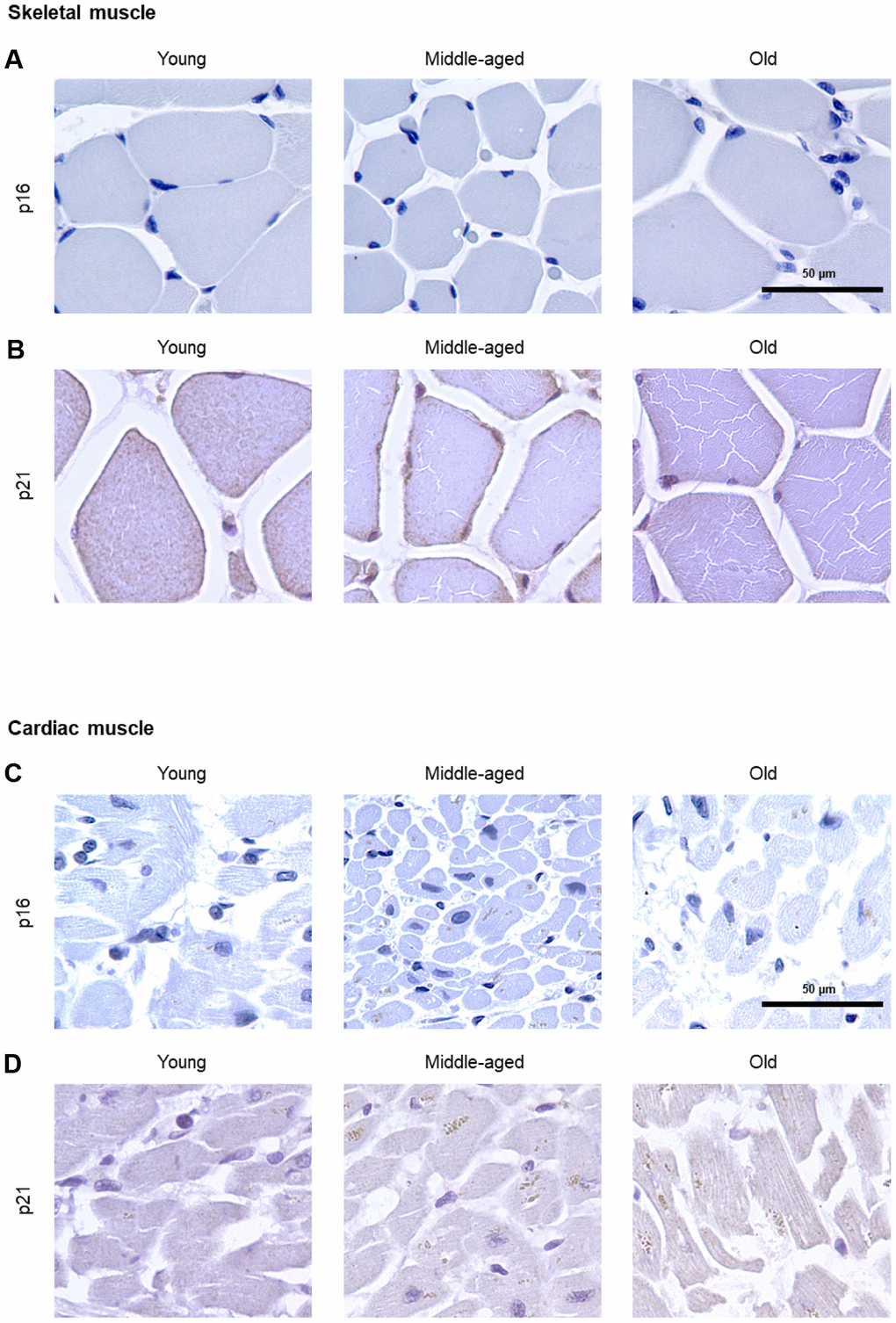 Yet in other organs, advancing age did not elevate the numbers of cells expressing either p16 or p21 [e.g., lung (Figure 8)], and in some cases, these markers were undetectable in all age groups [e.g., skeletal or cardiac muscle (Figure 9)], suggesting that senescence in these organs may be characterized by other protein expression programs. Alternatively, mechanisms to clear senescent cells from tissues, such as immune cells [41], may be more active in the removal of p16- and/or p21-expressing cells in these organs.