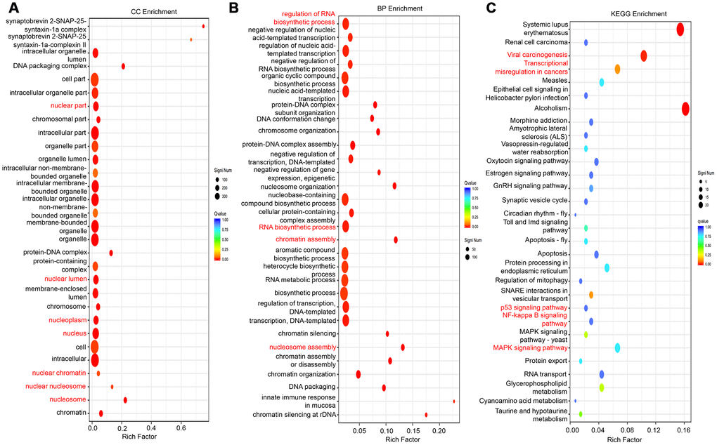 RNA sequencing was applied to explore the gene expression profile changes after lncRNA-LALR1 silencing. The results showed that knockdown of lncRNA-LALR1 upregulated 540 genes and downregulated 145 genes (fold change>2, P<0.05) (Supplementary Figure 3A). GO analysis revealed that lncRNA-LALR1 was profoundly correlated with nuclear components and processes (Figure 4A–4B, Supplementary Figure 3B). Furthermore, KEGG analysis determined that lncRNA-LALR1 silencing significantly changed signaling pathways such as p53 signaling pathway, NF-κB signaling pathway and MAPK signaling pathway (Figure 4C). These results showed that lncRNA-LALR1 might promote the progression of HCC through regulating nuclear processes.
