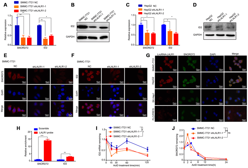 The expressions of the top 16 differentially expressed genes were then verified by qRT-PCR. The results showed that knockdown of lncRNA-LALR1 significantly decreased SNORD72 (P<0.01) and ID2 expression (P<0.01) (Supplementary Figure 3C). We also found that knockdown of lncRNA-LALR1 lowered the expression of other snoRNAs (P<0.01) (Supplementary Figure 4). We verified that knockdown of lncRNA-LALR1 significantly decreased the expression of SNORD72 and ID2 in both SMMC-7721 (P<0.01) and HepG2 cells (P<0.05) (Figure 5A–5D). FISH assay also confirmed the results (Figure 5E–5F). Although it has been reported snoRNAs could shuttle between cytoplasm and nucleolus, the sub-cellular localization of SNORD72 has yet to be revealed. We found that SNORD72 was expressed in both cytoplasm and nucleolus (Figure 5G). Interestingly, we found that lncRNA-LALR1 co-localized with SNORD72 in HepG2, SMMC-7721, PLC/PRF/5, and SK-Hep1 cells (Figure 5G). RNA pulldown assay revealed that lncRNA-LALR1 could interact with SNORD72 (P<0.001) and ID2 mRNA (P<0.01) (Figure 5H). As lncRNAs could regulate the target molecules expression at post-transcriptional levels [16], we tested the effect of lncRNA-LALR1 on the mRNA stability of SNORD72 and ID2 mRNA in HCC cells. We found that knockdown of lncRNA-LALR1 significantly decreased the stability of ID2 mRNA (P<0.05) (Figure 5I) but not SNORD72 (P>0.05) (Figure 5J). Taken together, these results demonstrated that lncRNA-LALR1 unpregulates SNORD72 and stabilizes ID2 mRNA in HCC cells.
