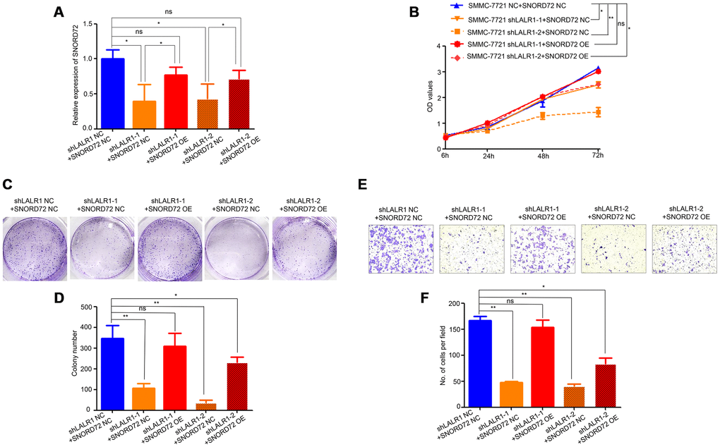 We then overexpressed SNORD72 in lncRNA-LALR1-knockdown cells and discovered SNORD72 expression also increased compared with corresponding negative control cells. (P<0.05) (Figure 7A). We found that overexpression of SNORD72 restored the proliferation (Figure 7B) and colony formation (Figure 7C–7D) of SMMC-7721 cells. Moreover, overexpression of SNORD72 also increased the invasion capacity of lncRNA-LALR1-knockdown cells (Figure 7E–7F).