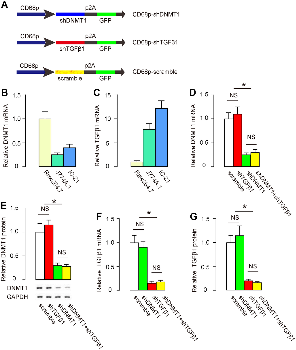 Several mouse macrophage lines (RAW264.7, J774A.1 and IC-21) were purchased from American Type Culture Collection (ATCC, Rockville, MD, USA) and were cultured in Dulbecco’s modified Eagle medium (DMEM, Gibco; Life Technologies, Carlsbad, CA, USA) with 10% fetal bovine serum (FBS, Sigma-Aldrich, St Louis, MO, USA), penicillin (100μg/ml) and streptomycin (250ng/ml) at 37°C, in a 5% CO2 atmosphere. AAV serotype 2 vectors were generated by transfection of human embryonic kidney 293 cells. shDNMT1 (5'-CCGGCCCGAGTATGCGCCCATATTTCTCGAGAAATATGGGCGCATACTCGGGTTTTTG-3'; target sequence: CCCGAGTATGCGCCCATATTT) and shTGFβ1 (5'-CCGGACTGCGGATCTCTGTGTCATTCTCGAGAATGACACAGAGATCCGCAGTTTTTT-3’; target sequence: ACTGCGGATCTCTGTGTCATT) used NIH published sequences. The scramble sequence was 5’-GGTATCTACTAGATGTACT-3’. Human CD68 promoter was obtained from Addgene (#34837, Addgene, Watertown, MA, USA) [34]. Transfection was performed with Lipofectamine 3000 reagent (Invitrogen, CA, Carlsbad, USA), according to the instructions of the manufacturer. The prepared virus was stored at -80°C. Titration of viral vectors was determined using a dot-blot assay.
