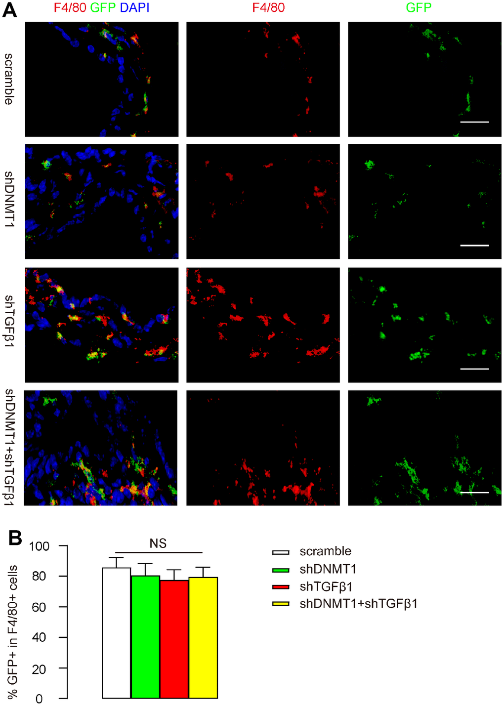 After LDD was induced in mice, orthotopic injection of these AAVs into LDD-mice was performed. Mice in the scramble group received an orthotopic injection of 100 μl 1011 AAV-pCD68-scramble; mice in the shDNMT1 group received an orthotopic injection of 100 μl 1011 AAV-pCD68-shDNMT1; mice in the shTGFβ1 group received an orthotopic injection of 100 μl 1011 AAV-pCD68-shTGFβ1; mice in the shDNMT1+shTGFβ1 group received an orthotopic injection of 50 μl 0.5X1011 AAV-pCD68-shDNMT1 and 50 μl 0.5X1011 AAV-pCD68-shTGFβ1. Mice were kept for 4 weeks before analysis. IHC showed exclusive detection of GFP in F4/80+ macrophages in all groups, and the percentage of F4/80+ macrophages that was positive for GFP (transduced cells) was quantified. These data are shown by representative images (Figure 2A), and by quantification (Figure 2B), and they suggest that the CD68 promoter in AAVs allows specific targeting of macrophages with high transduction efficiency.