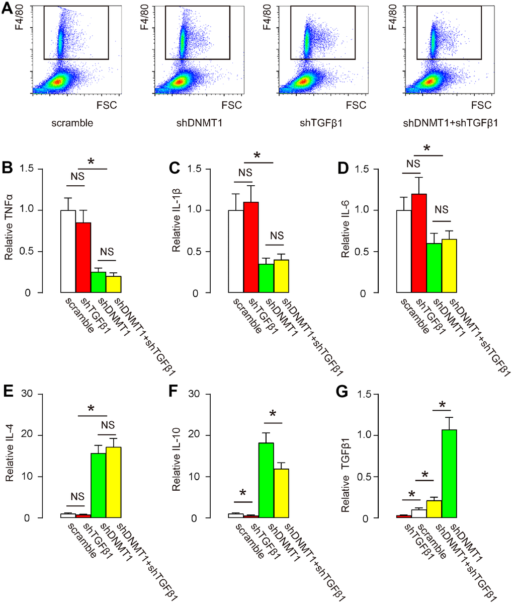 Next, we examined cytokine production by F4/80+ macrophages in the degeneration zone. Flow cytometry for F4/80 was performed as shown by representative flow charts (Figure 3A). We found that shDNMT1 significantly reduced pro-inflammatory cytokines TNFα (Figure 3B), IL-1β (Figure 3C) and IL-6 (Figure 3D), significantly increased anti-inflammatory cytokines IL-4 (Figure 3E) and IL-10 (Figure 3F), consistent with the known function of DNMT1 as an M2 macrophage polarizor. shDNMT1 also significantly increased TGFβ1 levels (Figure 3G), which may have resulted from its mediation of the M2 priming process, since TGFβ1 is mainly produced and released by M2c macrophages. shTGFβ1 alone did not significantly alter levels of most of these cytokines, including TNFα (Figure 3B), IL-1β (Figure 3C), IL-6 (Figure 3D) and cytokines IL-4 (Figure 3E), consistent with prior evidence that TGFβ1 is not a direct regulator of macrophage polarization. However, shTGFβ1 significantly decreased IL-10 (Figure 3F) and TGFβ1 (Figure 3G). Combination with shTGFβ1 did not attenuate the suppressive effects of shDNMT1 on pro-inflammatory cytokines (Figure 3B–3D) or the stimulatory effects on anti-inflammatory cytokines (Figure 3E); only the regulation by shDNMT1 on IL-10 and TGFβ1 was affected (Figure 3F, 3G), likely due to an interaction between IL-10 and TGFβ1.