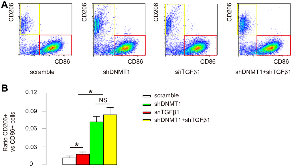 Macrophage polarization was examined by flow cytometry. CD86 is an M1 macrophage marker and CD206 is an M2 macrophage marker. Flow cytometry for CD86 and CD206 on F4/80+ cells was then performed as shown by representative flow charts (Figure 4A), and by quantification of the ratio of CD206+ M2 macrophages to CD86+ M1 macrophages (Figure 4B). Our data showed that shTGFβ1 only slightly increased this ratio, while shDNMT1, with or without shTGFβ1, significantly and comparably increased this ratio (Figure 4A, 4B). This finding suggests that shDNMT1 induced M2 macrophage polarization, which was not significantly affected by co-applied shTGFβ1.