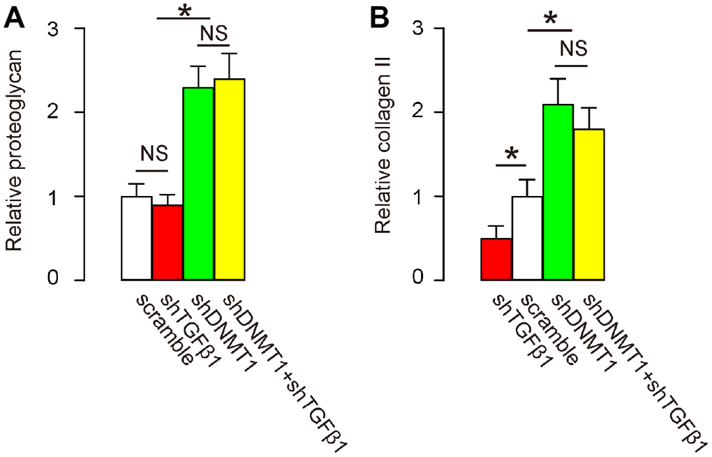 Decreases in both proteoglycan and collagen II that occur in disc matrix molecules are known to contribute to the loss of disc function with aging as well as disc degeneration [31, 32]. Surprisingly, the suppression of TGFβ1 did not appear to affect the salvage effects of inhibition of DNMT1 on proteoglycan and collagen II, which may in fact reflect compensatory effects of factors other than TGFβ1.