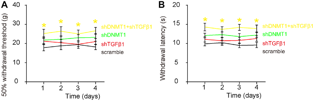 Von Frey filament test was then applied to evaluate the mechanical and thermal pain in 4 consecutive days. Significant decrease in mechanically induced withdrawal threshold (Figure 7A) and significant in thermally induced withdrawal latency of the paw (Figure 7B) were only detected in mice that had received combined shDNMT1 and shTGFβ1, but not detected in mice that had received either shDNMT1 or shTGFβ1 alone, compared to mice that had received scramble. These data suggest that combined shDNMT1 and shTGFβ1 may have an effect against LDD-associated pain.