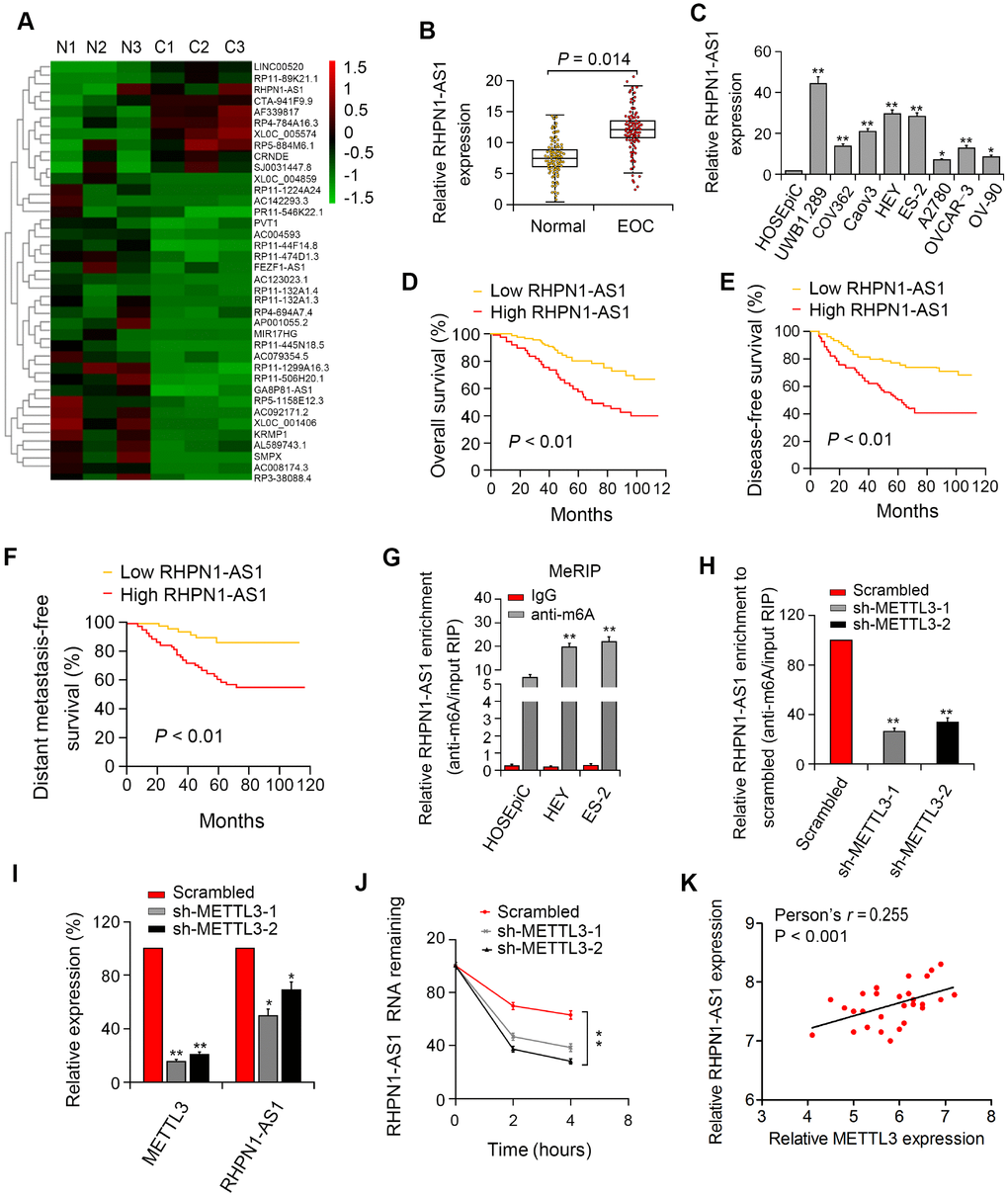 To investigate the presence of m6A modification in RHPN1-AS1, we first predicted the m6A locus using the bioinformatics pipeline M6avar (http://m6avar.renlab.org/) and identified the M6A sequence motifs in the last exon (positions 1794 and 3528). Next, we performed RIP analysis on HEY, UWB1.289, and HOSEpiC cells. The level of m6A in UWB1.289 and HEY cells was significantly higher than that in HOSEpiC cells (Figure 1G, P < 0.01). Then, shRNA-METTL3 was transfected into HEY cells, and it was found that knockdown of METTL3 resulted in reduced levels of m6 of total RNA and RHPN1-AS1 (Figure 1H, P < 0.01). We then investigated whether m6A modification would affect RNA metabolism of RHPN1-AS1. Knockdown of METTL3 remarkably decreased the expression of RHPN1-AS1 (Figure 1I, P < 0.01). After blocking new RNA synthesis with actinomycin D, we measured the loss of RHPN1-AS1. The results showed that the stability of RHPN1-AS1 was reduced after METTL3 silencing (Figure 1J, P < 0.01). Moreover, RHPN1-AS1 is positively associated with METTL3 in EOC tissues (Figure 1K, P < 0.001). These findings demonstrated that the m6A level of RHPN1-AS1 was elevated in EOC, and the m6A modification of RHPN1-AS1 increased its transcriptional stability, which may be part of the reason that RHPN1-AS1 was considerably upregulated in EOC.