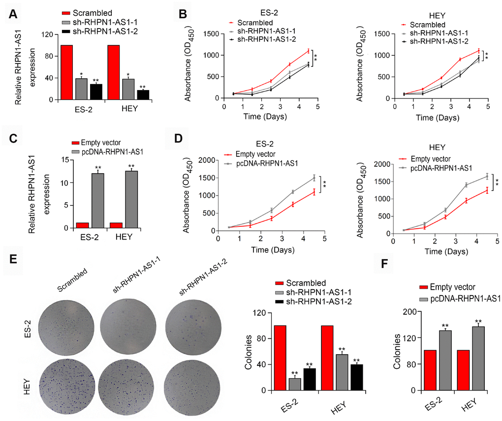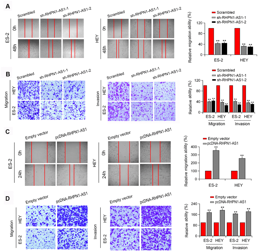 To assess the effect of RHPN1-AS1 on EOC cell viability and mobility, HEY and ES-2 EOC cells were transfected with RHPN1-AS1 shRNAs (sh-RHPN1-AS1-1 and -2). The knockdown efficiencies of RHPN1-AS1 shRNAs in HEY and ES-2 cells were confirmed by quantitative RT-PCR (Figure 2A). CCK-8 and colony formation analysis showed that the viability and clonogenic ability of HEY and ES-2 cells were significantly inhibited in the sh-RHPN1-AS1-transfected groups (Figure 2B, 2C). In contrast, overexpression of RHPN1-AS1 enhanced the growth and colony formation of EOC cells (Figure 2C, 2D, 2F). Moreover, wound healing assay and transwell assays further demonstrated that RHPN1-AS1 depletion repressed ES-2 and HEY cell migration and invasion (Figure 3A, 3B, P < 0.01). On the contrary, RHPN1-AS1 overexpression enhanced the migration and invasion of ES-2 and HEY cells (Figure 3C, 3D, P < 0.01). Taken together, these results suggested that RHPN1-AS1 acts as a carcinogenic lncRNA in EOC.