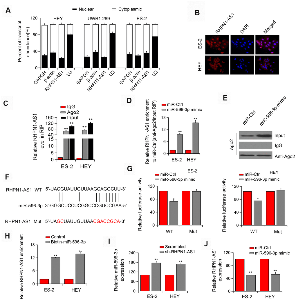 Next, we determined the localization of RHPN1-AS1 in cells and found that RHPN1-AS1 was primarily localized in the cytoplasm of HEY, ES-2, and UWB1.289 cell lines (Figure 4A, P < 0.05). Similar result was obtained by the FISH assay (Figure 4B). The endogenous RHPN1-AS1 was enriched in Ago2-RIP (Figure 4C, P < 0.01), indicating that RHPN1-AS1 might act as a ceRNA. Ago2-RIP analysis also showed that the content of RHPN1-AS1 in the miR-596 overexpression group was significantly higher than that in the miR-Ctrl group (Figure 4D–4E, P < 0.05). Dual-Luciferase reporter analysis showed that overexpression of miR-596 reduced the luciferase activity of RHPN1-AS1-WT but had no significant effect on RHPN1-AS1-Mut (Figure 4F–4G, P < 0.05). Besides, the biotin-labeled miRNA pull-down assay showed that the expression of RHPN1-AS1 was increased in EOC cells transfected with biotin-labeled miR-596 in comparison to the control group (Figure 4H, P < 0.05). Moreover, RHPN1-AS1 silencing significantly enhanced the expression of miR-596 (Figure 4I, P < 0.01). Meanwhile, miR-596 overexpression markedly inhibited the level of RHPN1-AS1 (Figure 4J, P < 0.01).