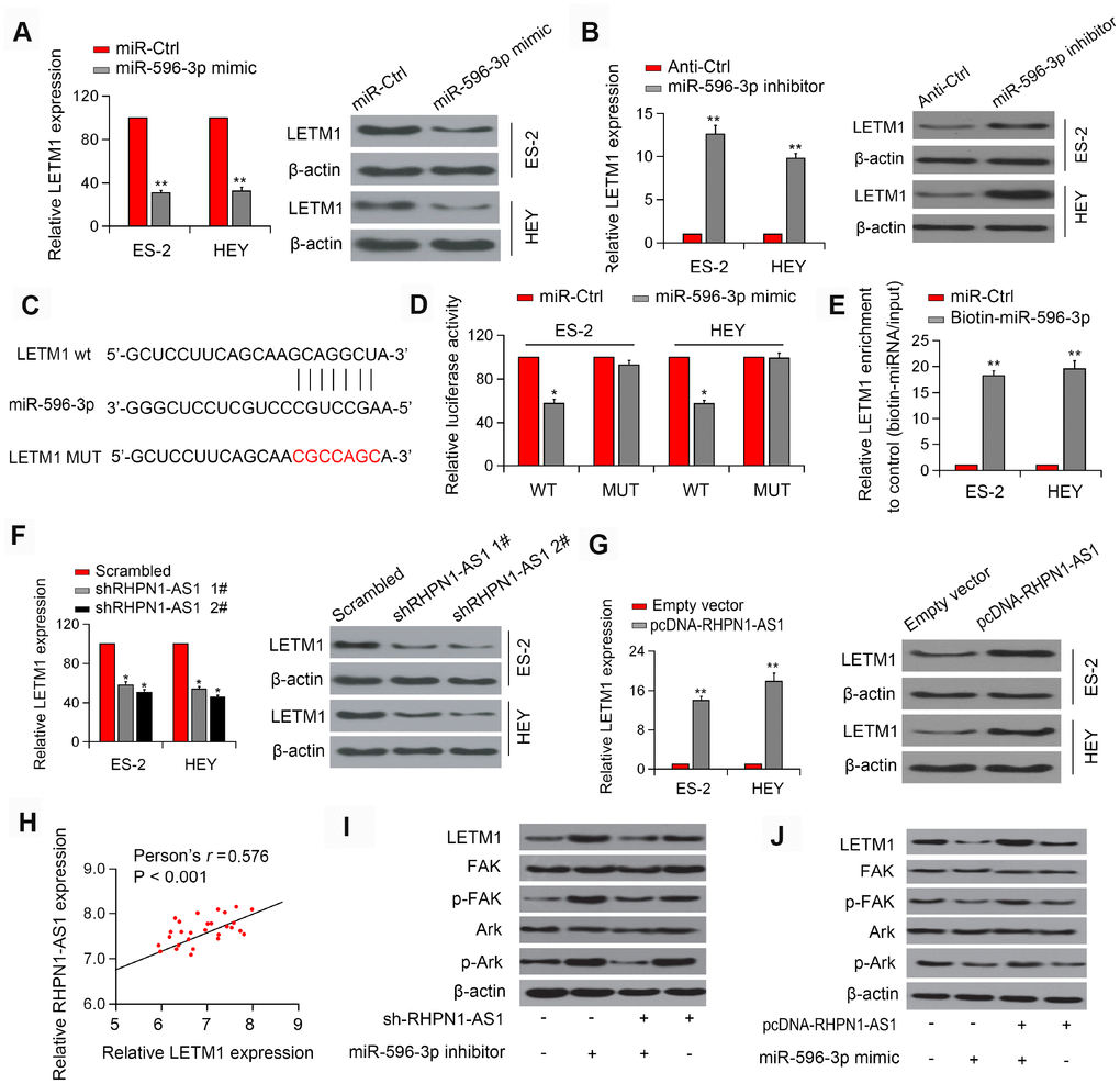 Using an online database, we predicted LETM1 as a potential target for miR-596 and confirmed this by luciferase reporter assay and biotinylated miRNA pull-down analysis. Furthermore, miR-596 overexpression repressed the expression of LETM1. In the present study, we demonstrated that RHPN1-AS1 bound to miR-596, which led to upregulation of LETM1 and activation of the FAK/PI3K/AKT signaling pathway, and thus promoted the viability and mobility of EOC cells.