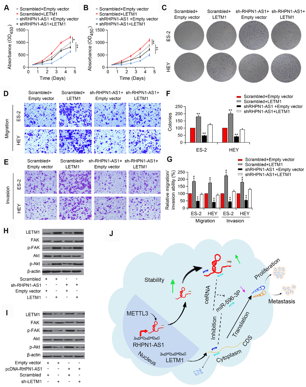 To demonstrate that RHPN1-AS1 promotes tumor progression in a LETM1-dependent manner, we transfected ES-2 and HEY cells stably overexpressing sh-RHPN1-AS1 with LETM1 overexpression vector. In ES-2 and HEY cells, in vitro functional experiments showed that recovery of LETM1 partially rescued the viability and mobility of EOC cells inhibited by RHPN1-AS1 knockdown (Figure 6A–6G, P < 0.01). Besides, overexpression of LETM1 increased the phosphorylation levels of FAK and Akt that were inhibited by RHPN1-AS1 downregulation (Figure 6H). On the contrary, depletion of LETM1 abolished the enhancive effects of RHPN1-AS1 on the phosphorylation of FAK and Akt (Figure 6I). These findings indicated that RHPN1-AS1 is a carcinogenic lncRNA that promotes EOC cell growth and metastasis via the PI3K/Akt signaling pathway (Figure 6J).