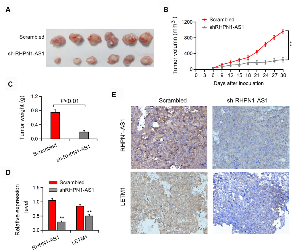 Next, we tested whether RHPN1-AS1 has the tumor-forming ability in vivo. Xenograft tumor model showed that knockdown of RHPN1-AS1 significantly reduced the subcutaneous tumor growth of EOC cells (Figure 7A–7C, P < 0.05). Moreover, LETM1 expression was significantly downregulated in tumors formed from RHPN1-AS1 knockdown cells compared with control cells (Figure 7D, 7E). We further found that restoration of LETM1 expression partially rescued the inhibition of tumor growth by RHPN1-AS1 silencing (data not shown).