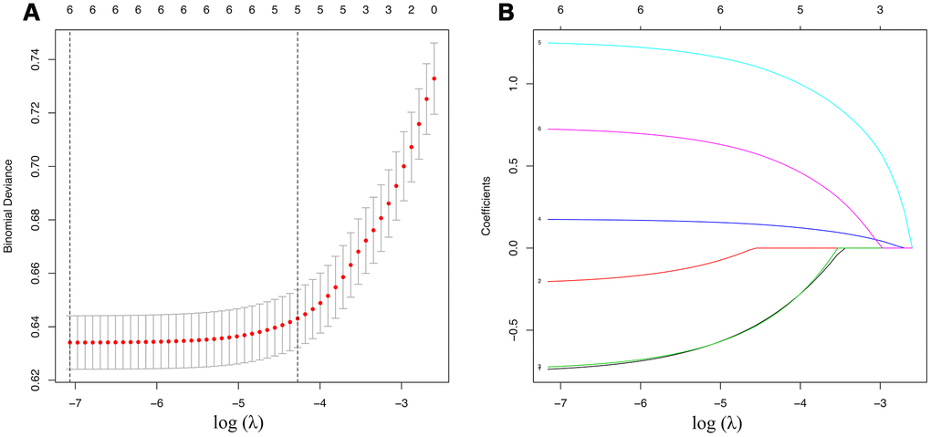 A total of 1812 in 15124 cases of training date set had positive cervical regional lymph nodes (12%). All the variables were found to be significantly correlated with cervical regional lymph nodes involvement via univariate analysis (Table 2) including age, race, sex, extension, multifocality, tumor size. To avoid the influence of confounding factors, we performed a LASSO regression analysis to re-evaluate the variables. Finally, we retained 6 variables with nonzero coefficients (Figure 1) as potential predictors of the prediction model. These predictors included age, race, sex, extension, multifocality, tumor size.