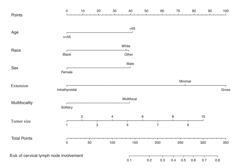 The dichotomous response variable of this model was the status of cervical lymph node involvement, which was divided into N0 and N1 (N1a+N1b). Then we extracted the following variables from the SEER as risk factors of cervical regional lymph node involvement in PTMC: age, race, sex, extension, multifocality, tumor size. Tumor size as a continuous variable was defined as the largest diameter of the primary PTMC. The race was classified as Black, White and other (American Indian/AK Native, Asian/Pacific Islander) provided by the SEER. According to the most recent 8th revision of TNM by the American Joint Committee on Cancer (AJCC), the threshold of age for high-risk of disease-specific mortality was updated form 45 years to 55 years, thus patients in this study were divided into two groups: younger patients (<55 years) and older patients (≥55 years). Multifocality was categorized as a solitary tumor and multifocal tumors. Multifocal tumors were defined as the presence of two or more sites in the thyroid gland, while a solitary tumor represented only one site within the thyroid. The extension of the primary PTMC was stratified into 3 groups: extension was confined within the thyroid capsule, minimal extension (strap muscle) and gross extension (nerves, esophagus, larynx, sternocleidomastoid muscle, etc). The multifocality and extension were both based on the final pathology.